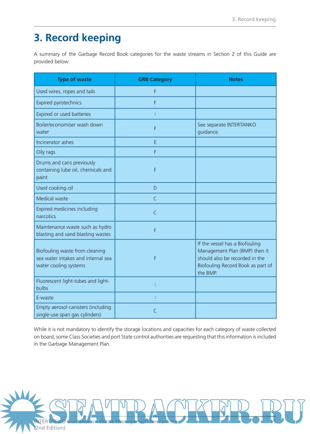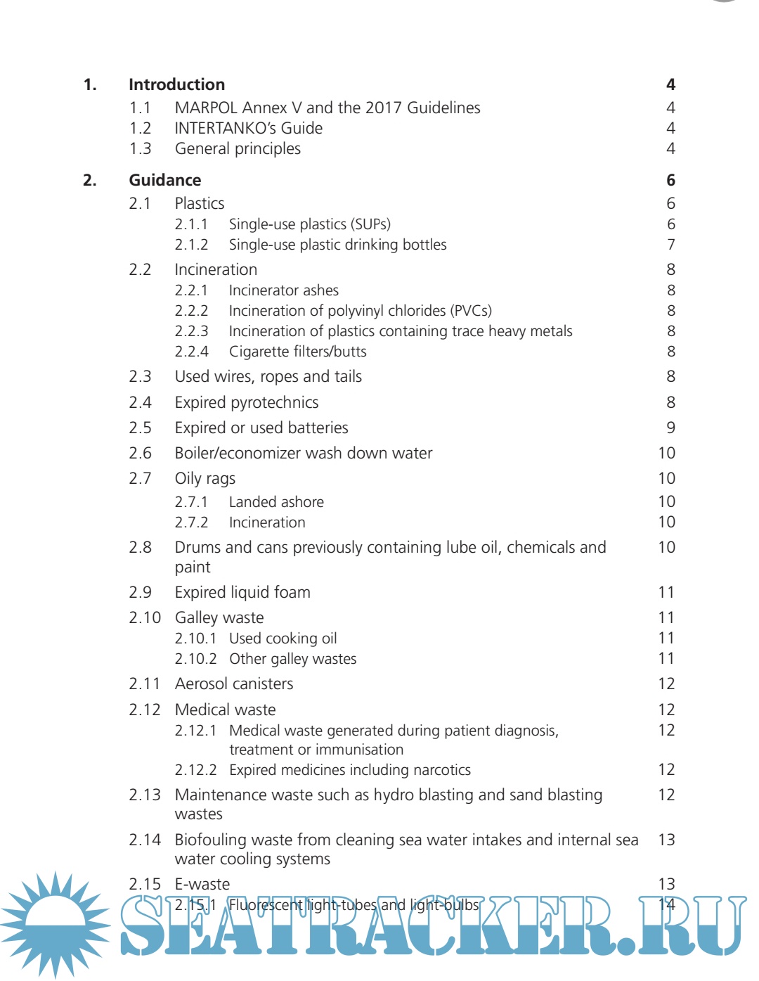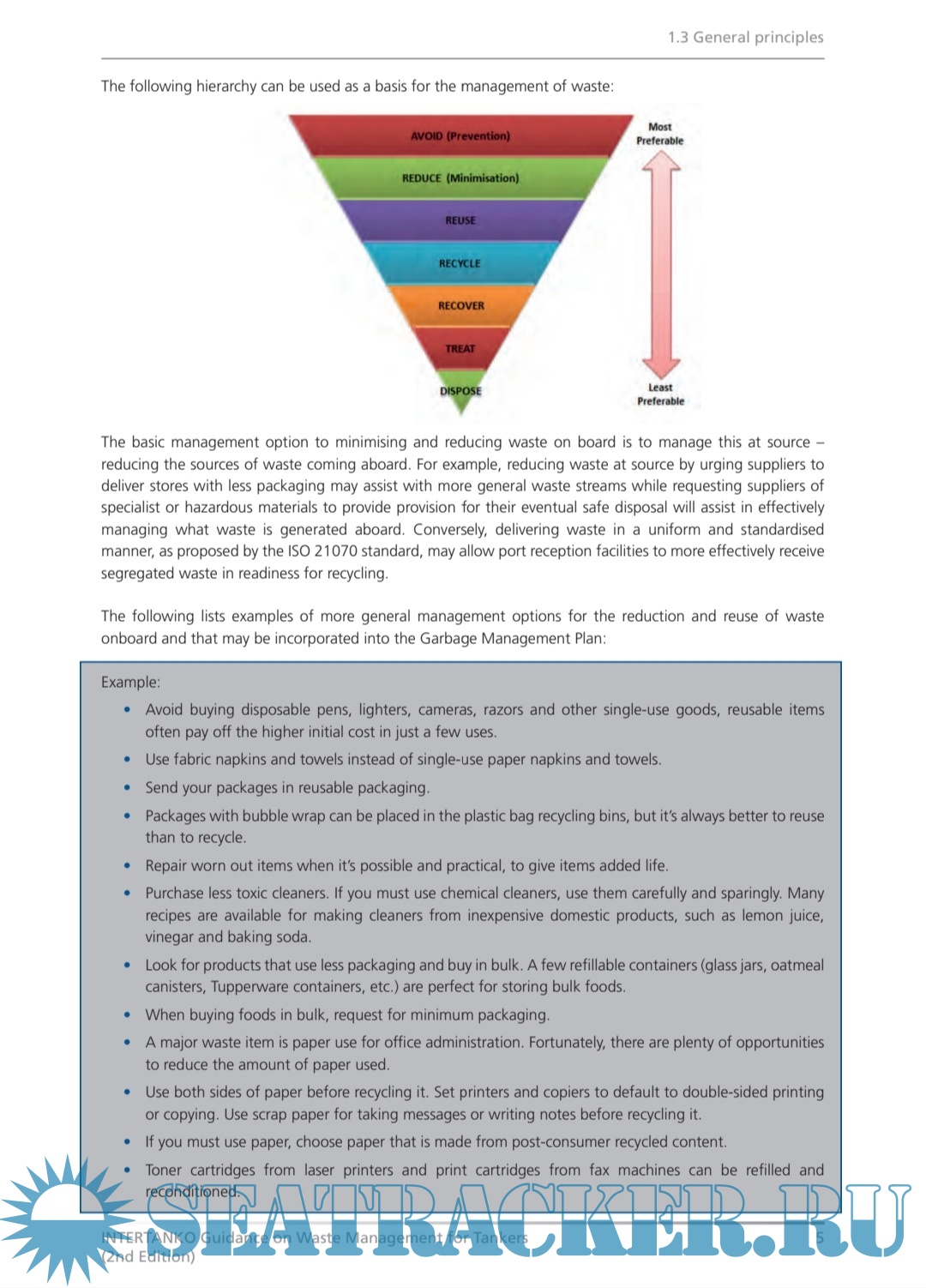 Year: 2020 Language: english Author: Intertanko Genre: Guide Publisher: Intertanko Edition: 2nd Format: PDF Quality: OCR without errors Pages count: 24 Description: This document provides guidance for the management of waste on-board tankers, taking into account the IMO requirements and guidance. Importantly, this document provides additional guidance for items that are either not covered in MARPOL Annex V and its Guidelines or that require additional management consideration from a practical perspective. When developing procedures for the management of regulated waste streams, INTERTANKO advises Members that any such procedures are checked against their Administration’s requirements. Furthermore, port States and regional regulatory authorities may have unilateral legislation in place for both MARPOL-regulated waste and other waste streams not regulated by MARPOL. As such, owners and operators are urged to maintain an up-to-date record of all national and regional requirements and ensure that all management procedures meet those requirements relevant to the vessel’s trading pattern.