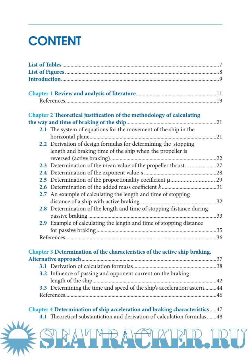 Description: One of the most serious problems of modern navigation is the accident rate that occurs due to inept or belated maneuvering of ships. As a result of accidents in the world, more than 200 ships sink every year and every fourth receives significant damage.Full-scale tests show that the stopping distance of large-tonnage ships turn out to be much less permissible, and shipbuilders are able to significantly reduce the astern power of such ships, making them cheaper at the expense of safety.The low accuracy of inertial-braking characteristics is mainly due to unqualified field tests. Analysis of graphs and tables based on the results of such tests show that the spread in the values of inertial-braking characteristics for ships of the same type reaches 30%, and in some cases even more. In many tables and graphs, inertial-braking characteristics are expressed in relative values and are not suitable for direct use when maneuvering a ship. Finally, even when graphical and/or tabular maneuvering information is available on the navigating bridge, it is difficult to use it when maneuvering a ship at night.The research carried out by the author results in:– creation of an alternative computational method for determining the iner-tial-braking characteristics of the ship, suitable for use on any on-board computer;– development of an improved methodology for calculating the path and time of acceleration and braking of the ship in various ahead motion modes;– development of a methodology for taking into account the influence of a passing and opponent current on the length of the stopping distance of the ship;– development of methods for solving applied problems, ensuring a decrease in the accident rate of ships during maneuvering.The obtained methods include the development of theoretical foundations, mathe-matical models and comparison of the calculated inertial-braking characteristics of ships with the data of a full-scale experiment. For the first time, to derive the calculated formulas for the time and stopping distance, theorems are used on the change in the momentum and kinetic energy during accelerated and decelerated motion of the ship. In the course of the study, the problems of calculating and formalizing the inertial-braking characteristics of the ship are being comprehensively solved. For the first time, the hypothesis that the nature of the change in the thrust force of the propeller during reverse can be approximated by linear equations has been substantiated and confirmed. The general results are used to calculate the inertial-braking characteristics of specific ships.