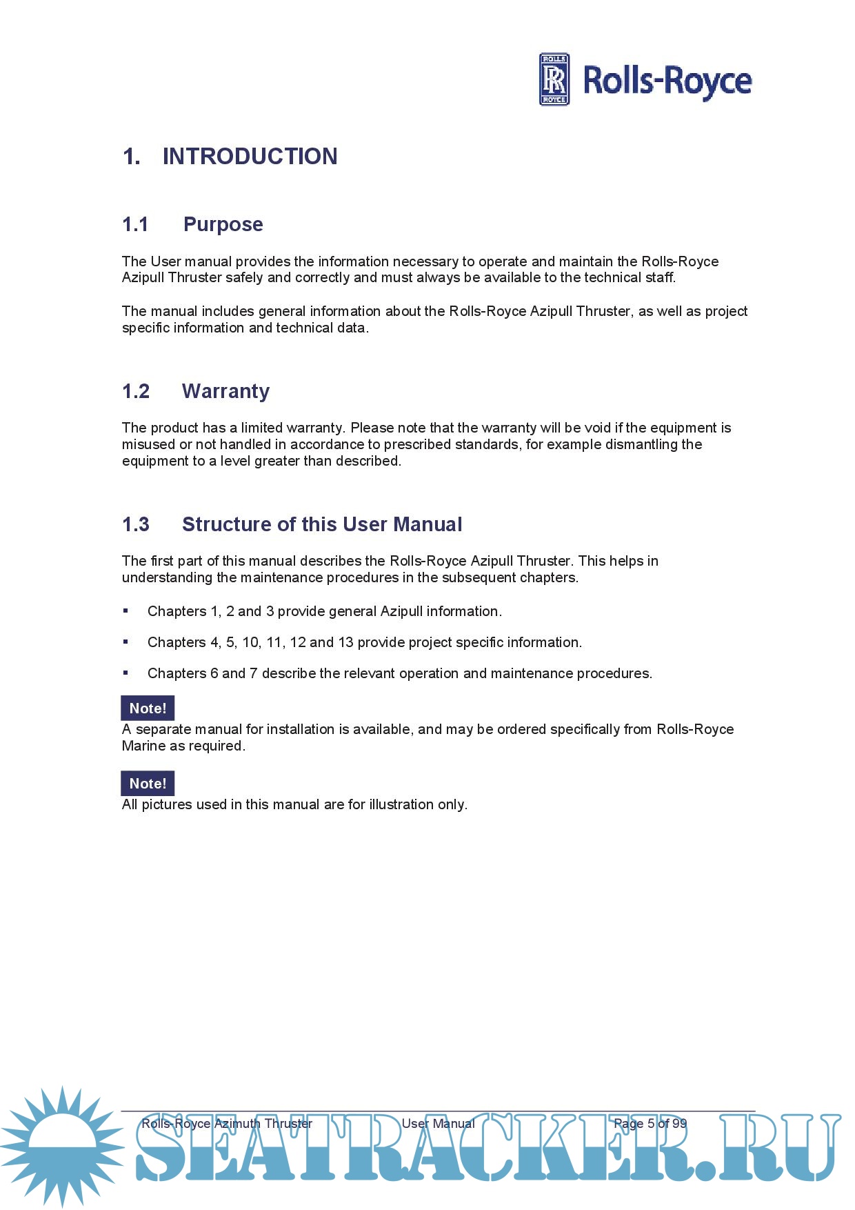 Description: The User manual provides the information necessary to operate and maintain the Rolls-Royce Azipull Thruster safely and correctly and must always be available to the technical staff.