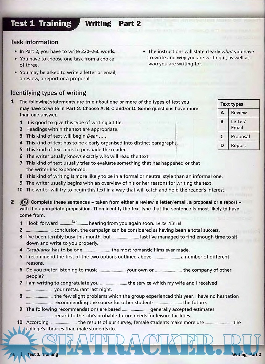 The book CAE Writing Skills combines creative practice of writing skills with systematic training for Paper. Activities are designed to develop planning, checking and revising techniques while providing key language practice. Practical tasks throughout the units train students in writing for specific contexts and introduce students to the different text types they will be asked to produce in the CAE Exam. Among them: