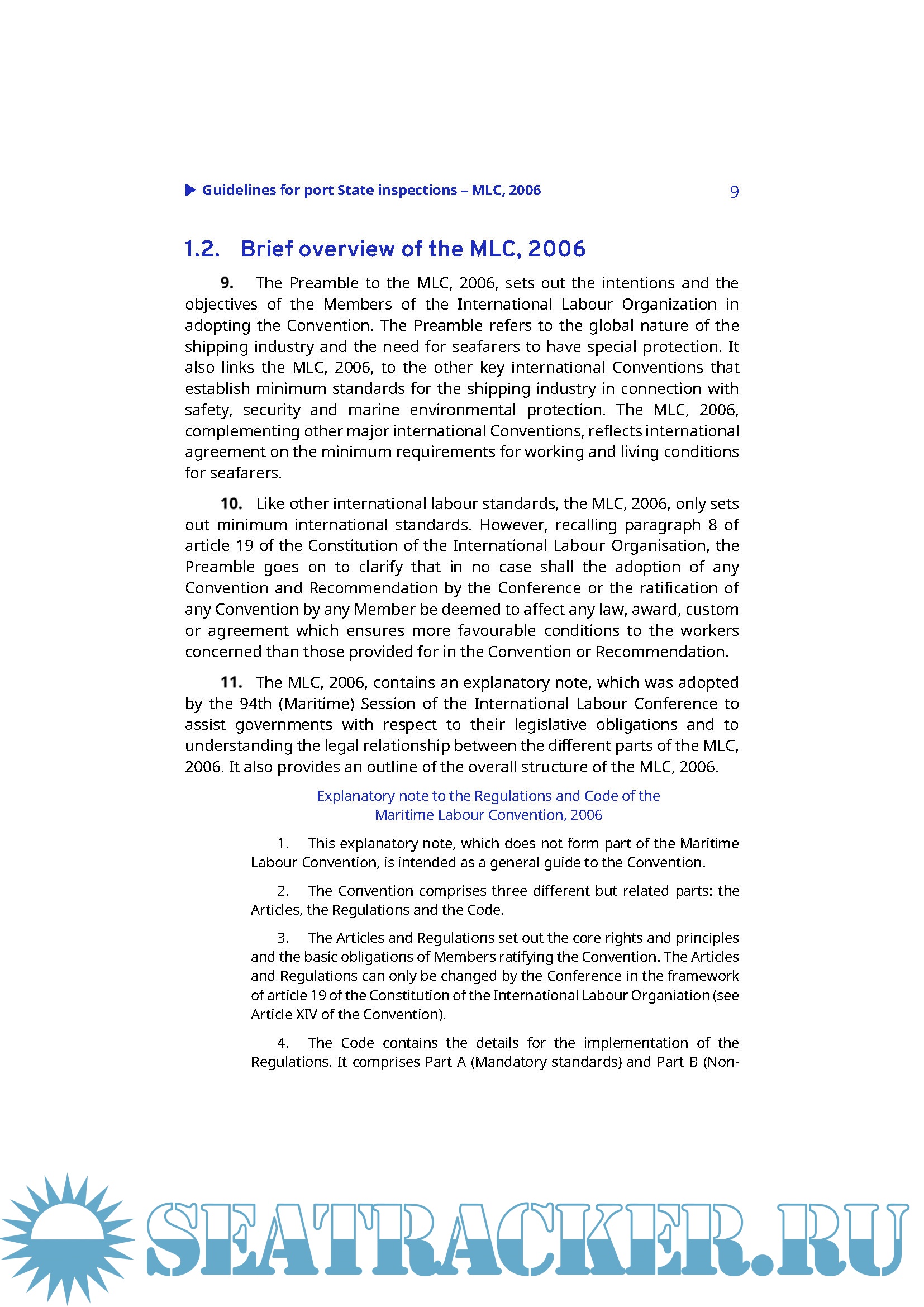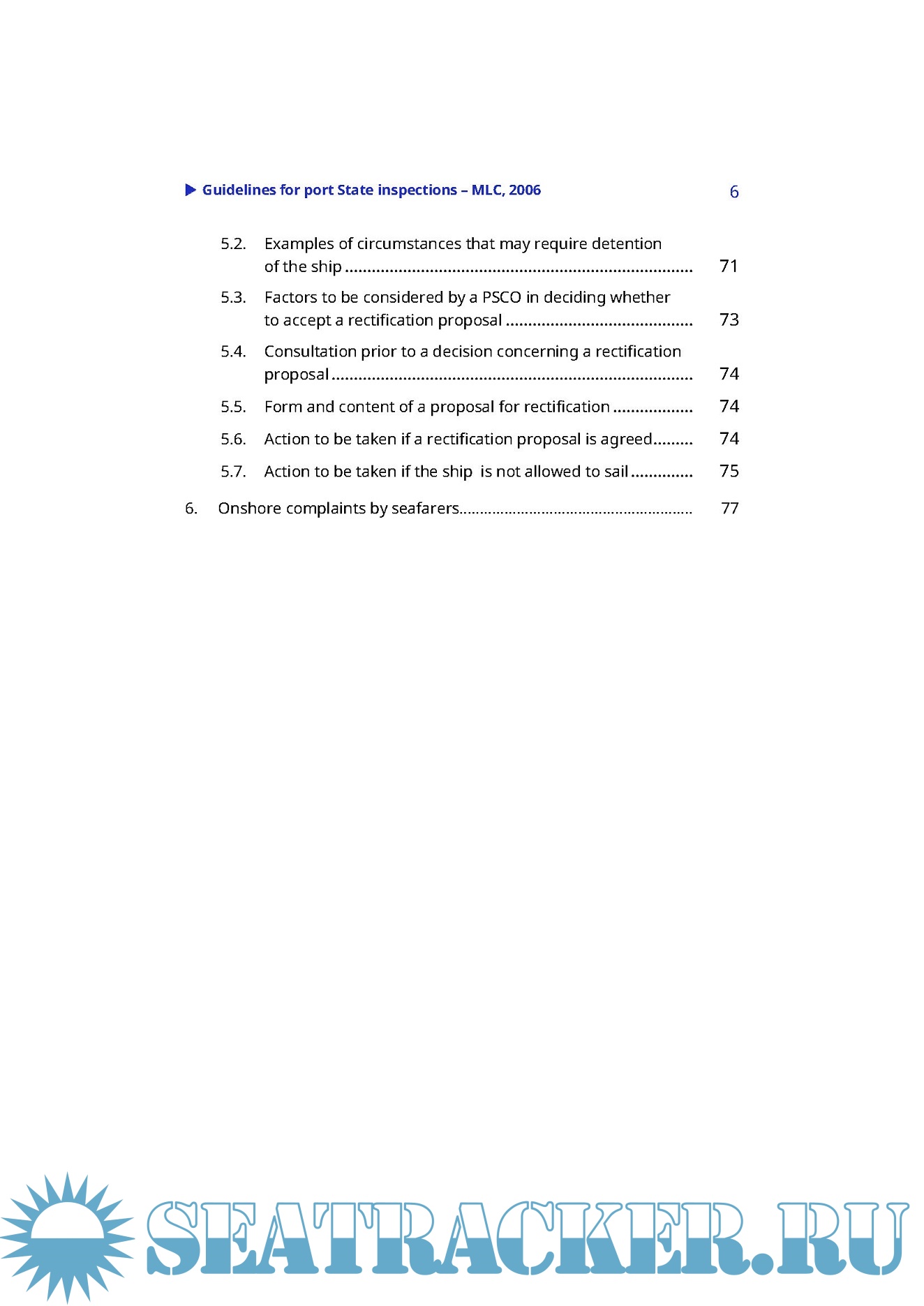 The present Guidelines provide practical advice to port State control officers (PSCOs) verifying compliance of foreign ships with the requirements of the MLC, 2006. Chapter 1 contains an overview of the special features of the MLC, 2006 and its key concepts. Chapter 2 relates to the required profile of PSCOs under the MLC, 2006. Chapter 3 covers the required review of documents in the case of ships that carry certification under the MLC, 2006. It explains when a more detailed inspection may be carried out. The main inspection tool is provided by Chapter 4, indicating the basic requirements to be complied with, sources of information for checking compliance and examples of deficiencies, in the 16 areas of working and living conditions that are mainly concerned. Chapter 5 provides guidance when deficiencies are found and when a ship may have to be detained in port. Chapter 6 relates to the handling of onshore complaints by seafarers.