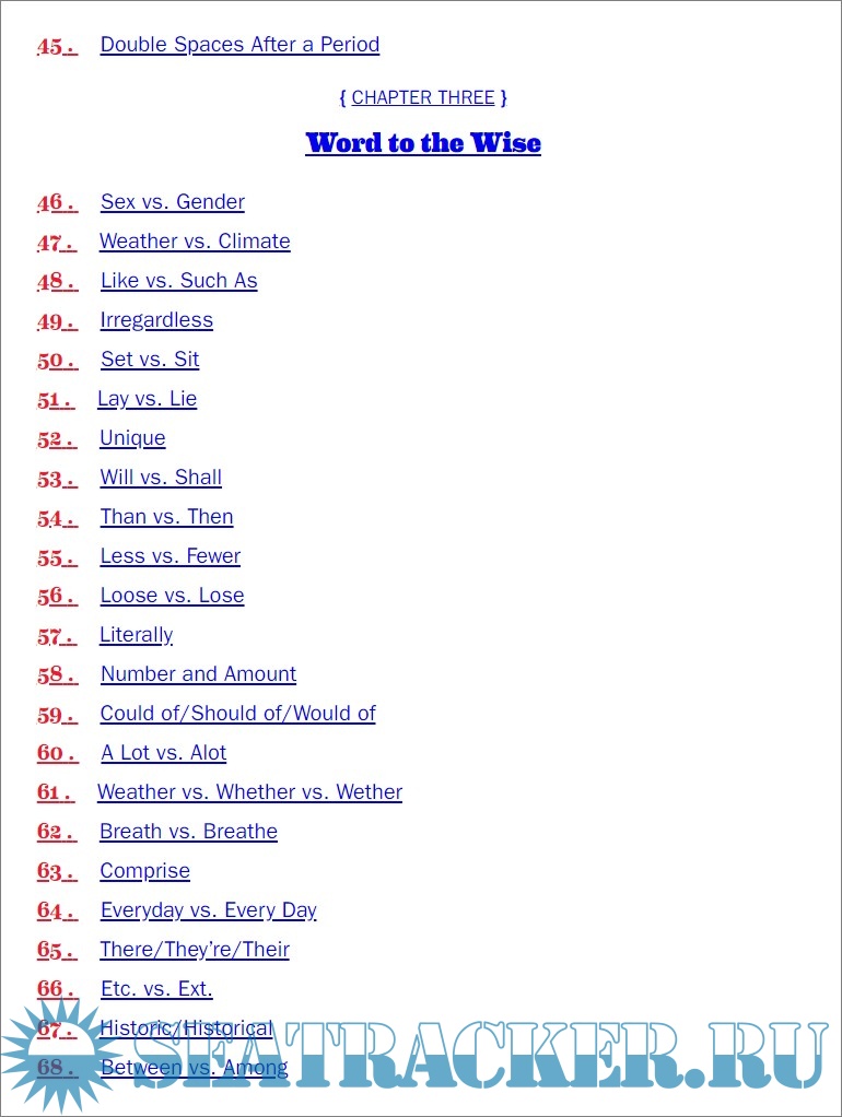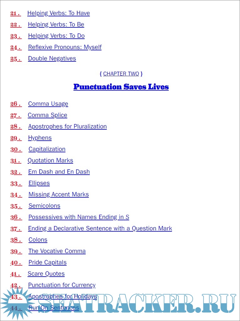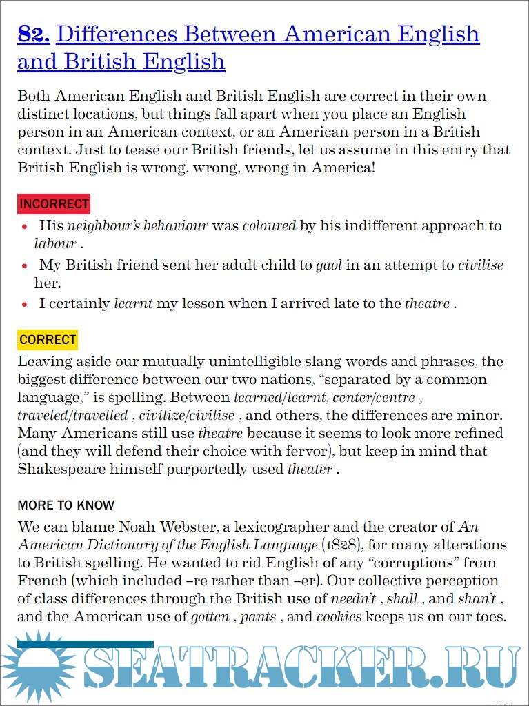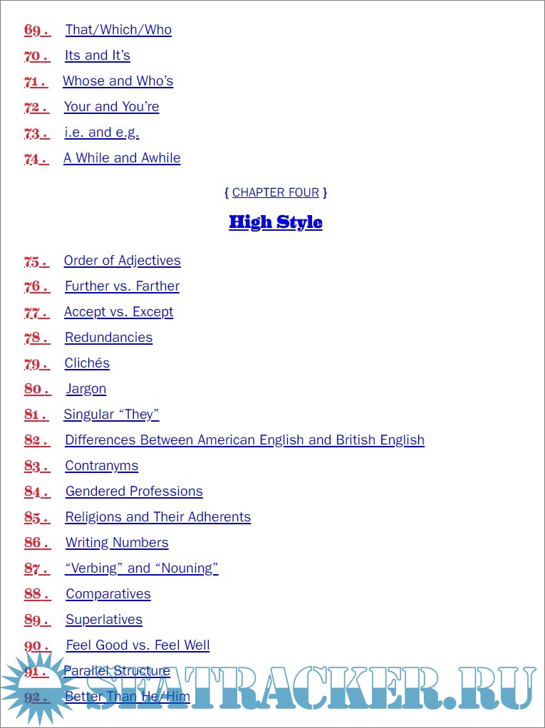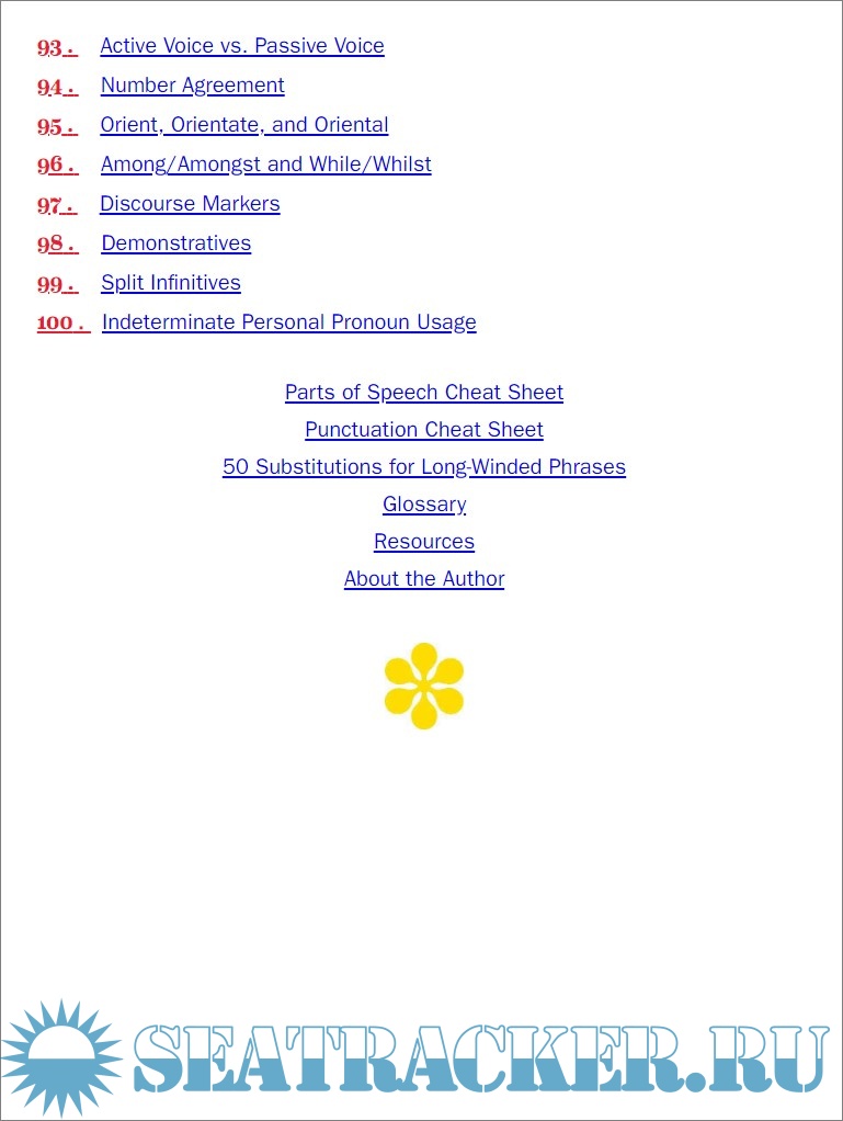 Description: The book is a practical, user friendly English grammar guide for perfect writing ands speaking, in order to avoid falling into the most common traps, with guidelines for incomplete sentences, possessive pronouns with gerunds, and so on. Each of the 100 entries has a brief explanation, incorrect examples, an explanation of correct usage, and several other information and further knowledge. A final section of the book is dedicated to extra resources, such as grammar, punctuation, word usage, and proper style.