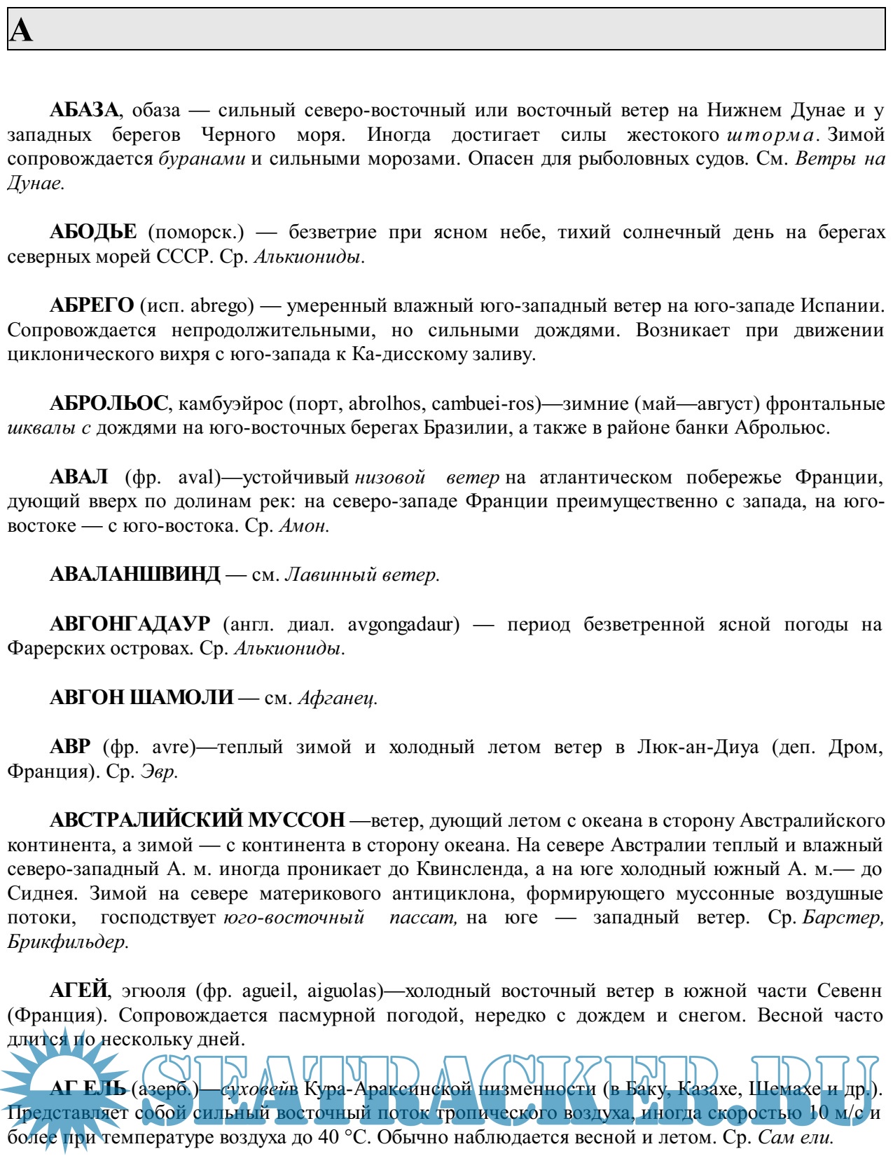 В Словаре приведены названия и характеристики ветров и ветровых систем планетарных и локальных масштабов, а также некоторые синоптические, метеорологические, гидродинамические, технические, географические и морские термины и характеристики, имеющие отношение к действию ветров.