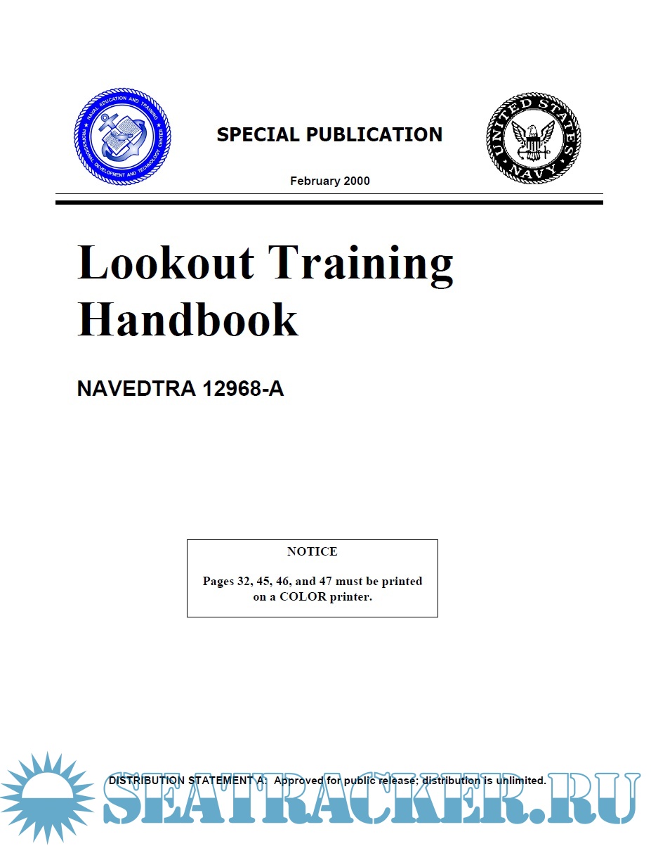 Description: This booklet is entirely dedicated to lookout training and procedures. A lookout is a person detailed to observe everything within an assigned sector and to report everything from that sector, usually to an officer of a military vessel. The safety and efficiency of the ship obviously depend to a great degree on the alertness and effectiveness of lookouts, and every vessel shall at all times maintain a proper look-out by all available means, as per rule 5. Even if written for the Navy, this guide is of interest for merchant and pleasure vessel, that may need to strengthen lookouts in poor visibility or close quarters conditions. This guide discusses and presents visual search patterns and contact reporting procedures; speed and track estimation; ship/aircraft recognition; Rules of the Road; buoy systems; special sea detail; restricted visibility steaming; and man-overboard procedures, along with lookout equipment you in your capacity as a lookout.