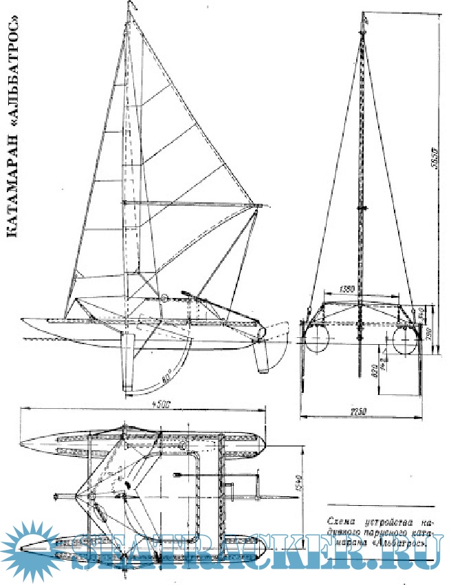 Описание: "До этого я построил штук 5 таких судов, отрабатывая конструкции различных схем, узлов, размерения, парусность и т.п. На одном из них на майские праздники 1979г. мы успешно совершили двухнедельный поход вдоль северного побережья Азова, изучая  вопросы мореходности небольших катамаранов. Кроме того, к 1979 году мои товарищи построили около десятка самых разных «легких» катамаранов этого класса, и весь сезон 1979г. мы интенсивно их испытывали. Все ценное с них я сразу же брал на «Прототип», а неудачное – запоминал. Если бы заводские конструкторы повторили «Прототип-1» 1:1, то вы бы сейчас имели вполне приличное судно, хотя и несколько морально устаревшее."