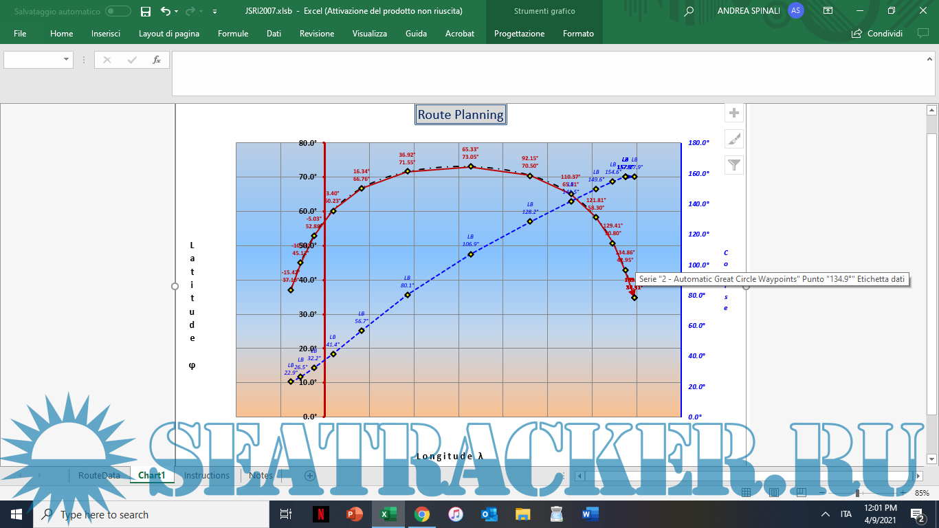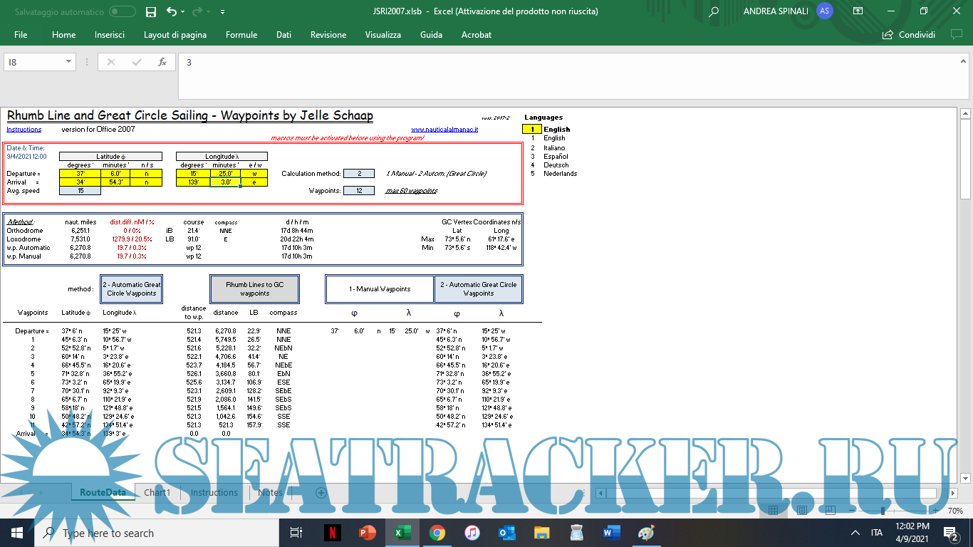 Excel программа для расчета плавания по Дуге Большого Круга (Great Circle Sailing) [2017]
