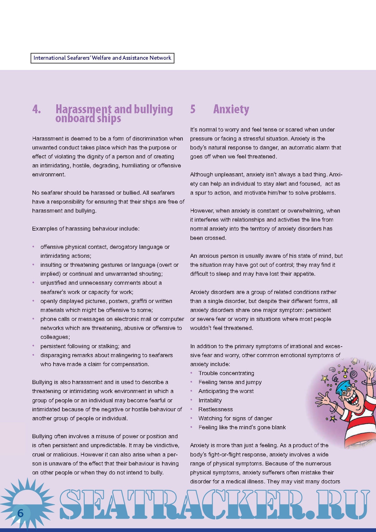Year: 2016 Language: english Author: ISWAN Format: PDF Quality: eBook Pages count: 12 Description: There are several factors that can impact seafarers’ mental health, such as job stress, family pressures and limited shore leave. Being away at sea can also make it difficult to access support. However, help is out there! We have developed a range of self resources to help seafarers manage and cope with low mood, stress and fatigue, and maximise their overall psychological wellbeing. Guidance for companies - Mentally Healthy Ships - provides information on developing and implementing mental health policies on board.