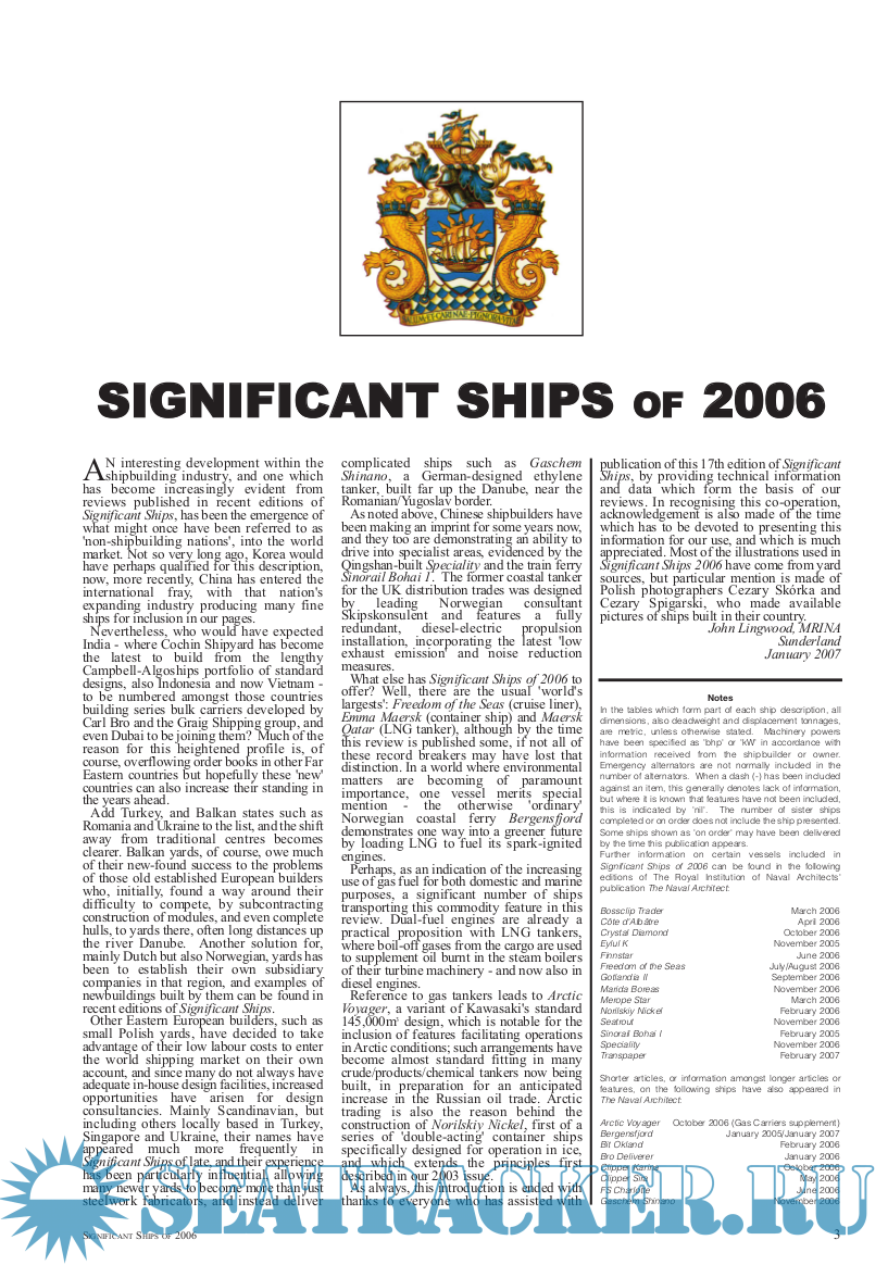 Significant Ships of 2006 follows the format of the sixteen previous editions. Two pages are devoted to every entry; on the first page appears a photograph of the ship in question (all in full colour), followed by a concise technical description highlighting the key features, this is supported by a comprehensive tabular list, detailing technical data. On the following page a set of general arrangement plans appears.