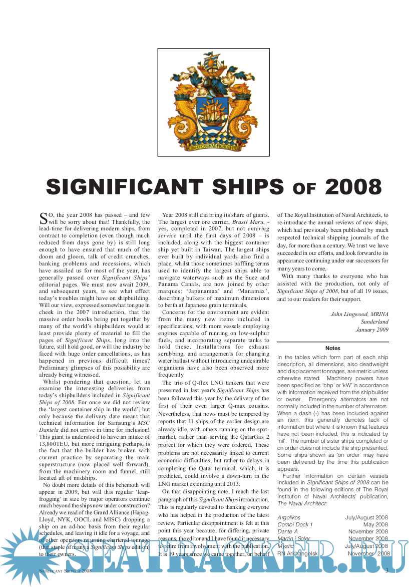 Description: Significant Ships of 2008 is a quality annual publication providing an invaluable reference source to some of the very best in today's ship design and construction. It gives technical details of approximately 50 selected merchant ships of all classes and types, mostly of some 100m in length and above, which were completed last year by shipyards worldwide.