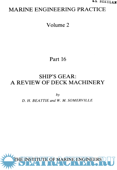 Year: 1978 Language: english Author: D. H. BEATTIE and W. M. SOMERVILLE Genre: Reference book Publisher: IMarEST ISBN: 0900976 780 Format: PDF Quality: Scanned pages Pages count: 66 Description: This booklet describes electrical and steam-powered machinery including its control system. Hydraulic power transmission is covered in Marine Engineering Practice Volume 1 Part 7 - Hydraulic Power Transmission in Marine Machinery by C.M. Joy C.Eng. and electric power is covered in Electricity Applied to Marine Engineering by W. Laws.