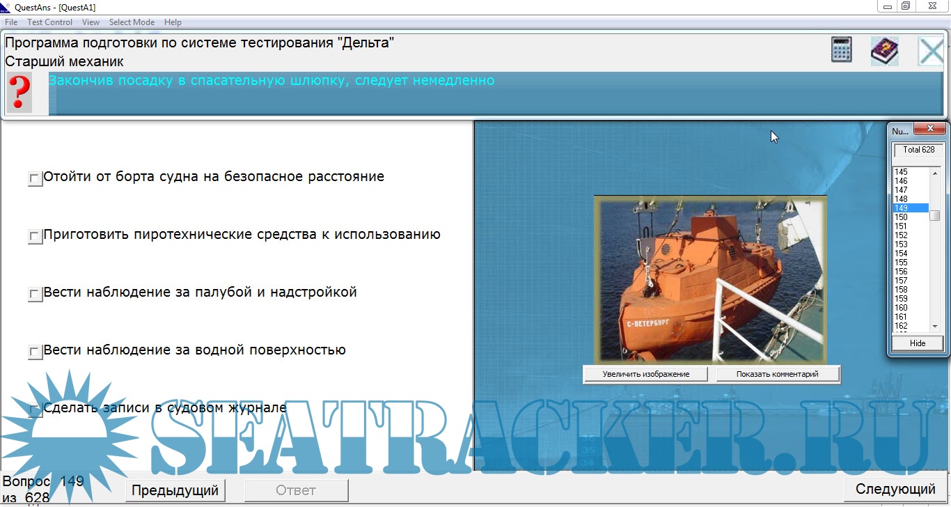 Версия: 2.02 Разработчик: ГМУ им. С.О.Макарова & ЗАО 'ЮНИКС МАРИН' Платформа: PC (Windows) Совместимость с Windows7: да Системные требования: Windows Язык интерфейса: только русский Таблэтка: Не требуется Описание: ПК "Дельта-Тест" предназначен для использования в качестве составной части единого государственного стандарта проверки знаний в образовательных учреждениях, УТЦ, БУТЦ/УТС и в морских квалификационных комиссиях, а также как элемент системы качества, создаваемой для учебно-тренажерных центров. Серия компьютерных программ "Дельта" предназначена для проведения проверки знаний членов экипажей судов и слушателей учебных заведений методом тестирования и предлагается к использованию в Морских квалификационных комиссиях, учебных заведениях Министерства транспорта РФ и Госкомрыболовства России, морских и береговых учебно-тренажерных центрах, крюинговых компаниях. Дельта - Старший Механик ( эмулятор) Инструкция.: Внимание! Вы работаете с эмулятором Дельта. Функции оригинальной программы скопированы только в том объеме, чтобы обеспечить подготовку к сдаче экзаменов в МКК. Запускающая программа – DeltaChiefEng.exe После этого произойдет загрузка вопросов из Дельты. Правильные ответы можно посмотреть, нажав кнопку Показать Комментарий Можно проверить свои знания: поставьте галочки возле правильных, по вашему мнению, ответов и нажмите кнопку Ответ