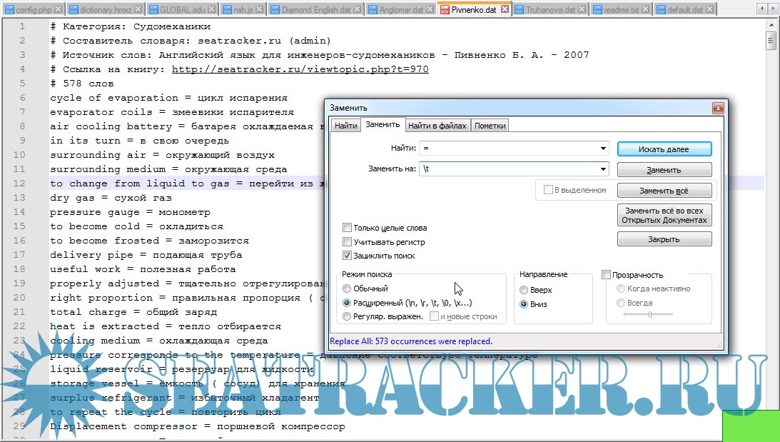 3. Стоит обратить внимание на то, что между словом и переводом используется символ табуляции. В Notapad++ можно легко это сделать через массовую замену как на скрине