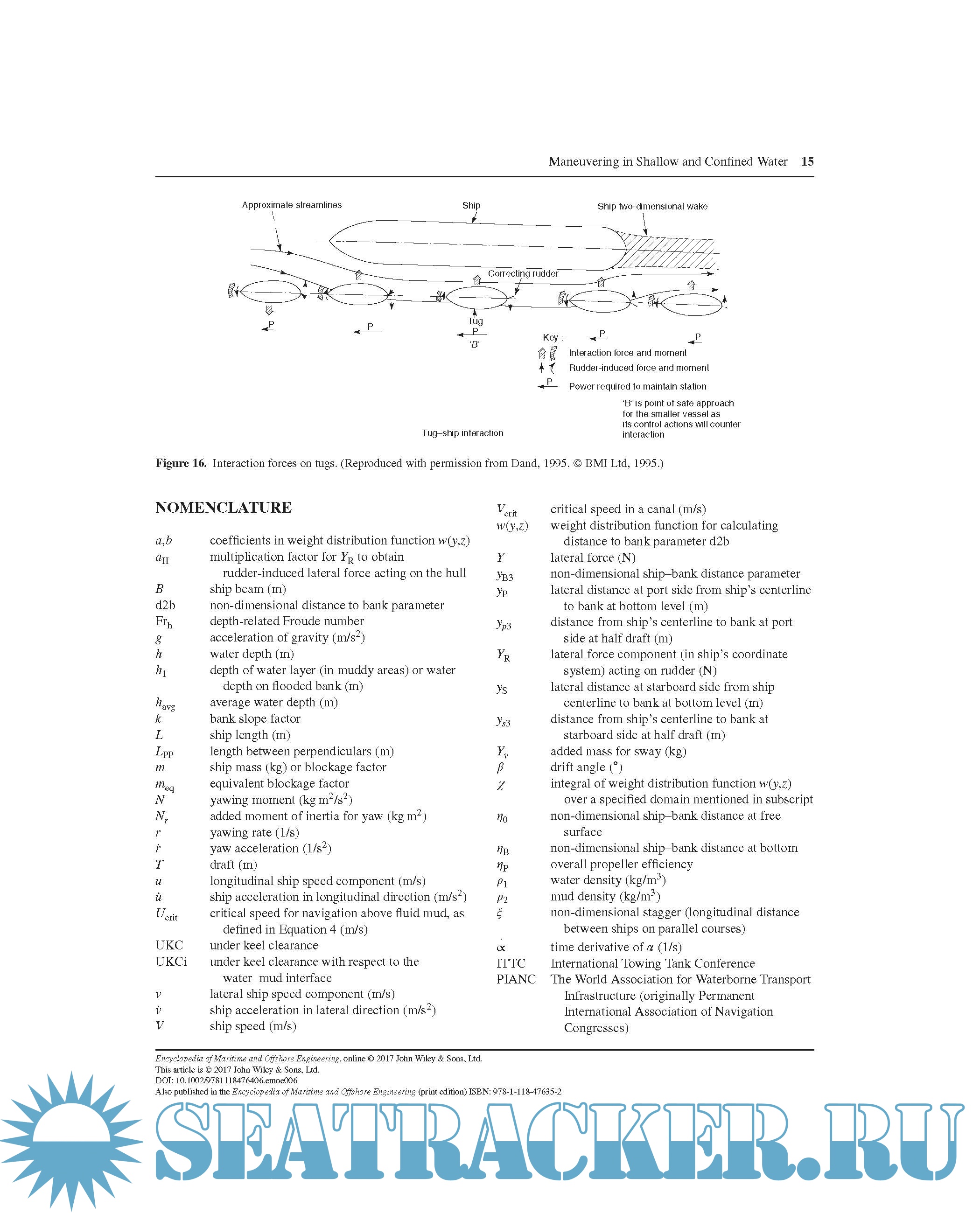 Year: 2017 Language: english Author: Marc Vantorre, Katrien Eloot Format: PDF Quality: eBook Pages count: 18 Description: The maneuvering characteristics are highly affected by the under‐keel clearance. In shallow water, the results of standard maneuvers reveal a decreased maneuverability and an increased straight‐line stability. This modified behavior is mainly to be ascribed to the modified flow around the hull, but also the control forces exerted by rudder and propeller are different compared to the deep‐water case. Besides the effect of vertical limitations, a ship navigating parallel to the horizontal boundaries of navigation areas will also experience the so‐called bank effects, that is, disturbing forces and moments due to the asymmetry of the flow around the hull.