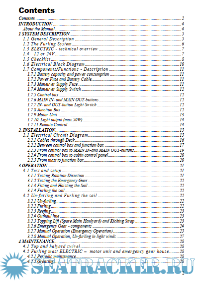 Год выпуска: 2014 Язык: английский Автор: Seldén Group Жанр: Руководство Издательство: Seldén Group Формат: PDF Качество: Отсканированные страницы + слой распознанного текста Количество страниц: 52 Описание: INTRODUCTION About the Manual To obtain the maximum benefit and enjoyment from your Seldén FURLING MAST ELECTRIC we recommend that you study this manual carefully. The manual is divided into four sections. One is a GENERAL DESCRIPTION of the system and of the included electrical and mechanical parts. The second section is dealing with INSTALLATION (the electrical components) of a system mounted on a new furling mast, and the third one describes how to OPERATE the system. The fourth section is about MAINTENANCE, and finally the fifth section describes installation of a FURLING MAST ELECTRIC unit on an F-mast already equipped with a Seldén manual furling system. This manual is a supplement to the “Manual for Furling Mast TYPE RA” (595-059-E) and “Manual for Furling Mast TYPE RB Mk II/RC Mk II” (595-063-E). The appropriate manual is included in your FURLING MAST ELECTRIC-documentation. To install and operate the system both this manual and the actual manual mentioned above, are required. This manual covers FURLING MAST ELECTRIC RA(12V), RB(12V), RC(12&24V) Доп. информация: МАТЕРИАЛ ВЫЛОЖЕН ИСКЛЮЧИТЕЛЬНО В ОЗНАКОМИТЕЛЬНЫХ ЦЕЛЯХ! Другие мои раздачи: https://seatracker.me/tracker.p...id=13371#results