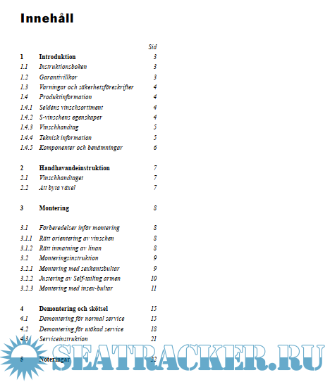 Year: 2016 Language: swedish Author: Seldén-Gruppe Genre: Guide Publisher: Seldén-Gruppe Format: PDF Quality: Scanned pages + text layer Number of pages: 24 Description: Instruktionsboken omfattar och refererar till fyra storlekar av S-vinschar: S30, S40, S48 och S54. Respektive modellbeteckning finns angiven på vinschens lock. Additional info: МАТЕРИАЛ ВЫЛОЖЕН ИСКЛЮЧИТЕЛЬНО В ОЗНАКОМИТЕЛЬНЫХ ЦЕЛЯХ! Другие мои раздачи: https://seatracker.me/tracker.p...id=13371#results