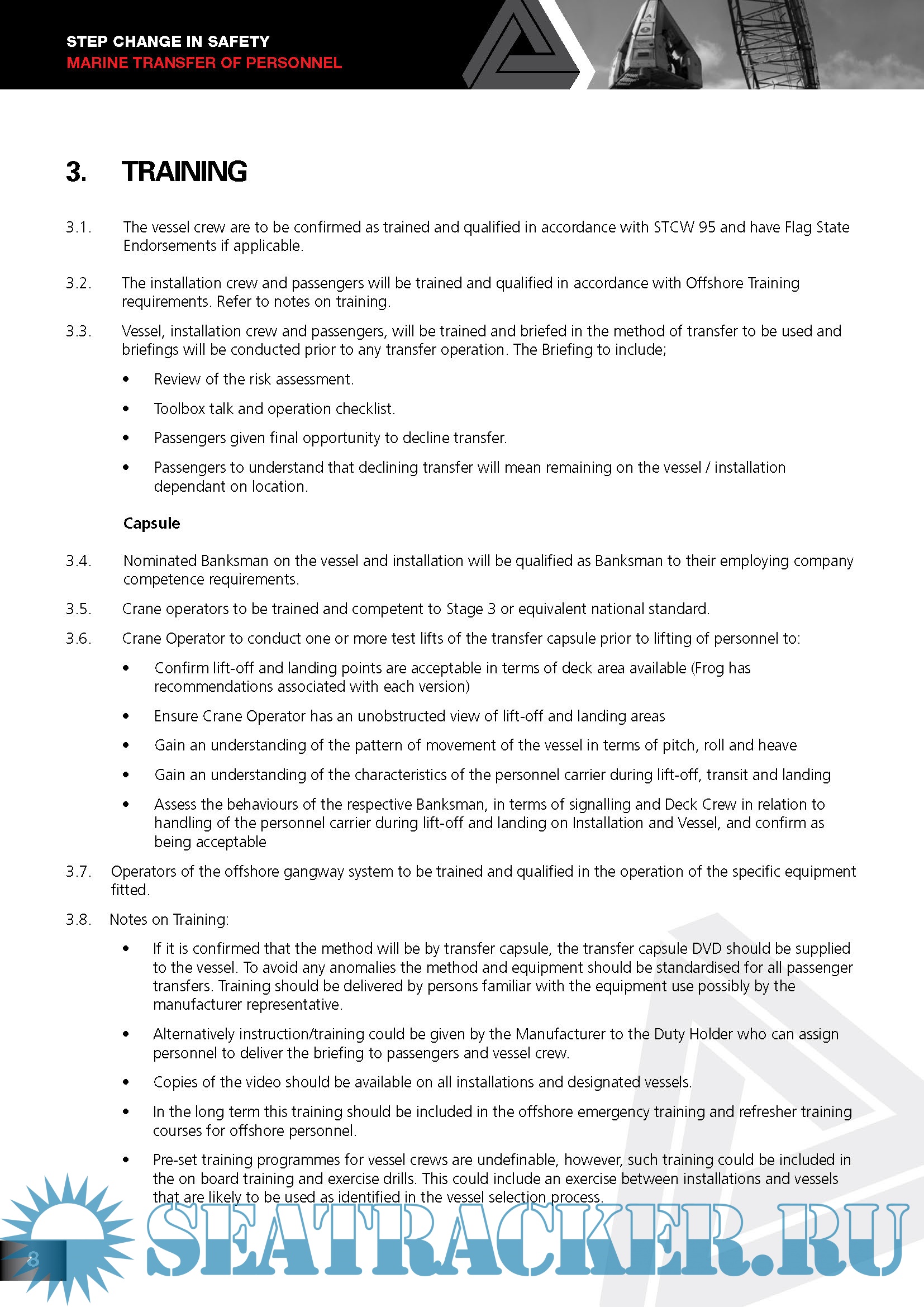 Year: 201x Language: english Author: Step Change in Safety Format: PDF Quality: eBook Pages count: 74 Description: The preferred method for transporting people offshore in the North Sea is by helicopter. However, there have been several occasions when this method of transportation has not been available, usually at short notice. These guidelines have been produced to allow a systematic process for identifying if and how the marine transfers of offshore personnel can be safely undertaken, either by basket transfer or by bridge link. These guidelines provide flow diagrams, risk assessments, minimum vessel technical speculations, breifing packs and general advice which will facilitate a standardised process for the transportation of personnel to and from offshore locations. This download includes Crane Transfer and Walk to Work Factsheet. Summary: If helicopters are not available to transfer offshore personnel, then these guidelines will allow you to decide if and how this could be done safely by a vessel. https://www.stepchangeinsafety.net/resources/marine-transfer-of-personnel/