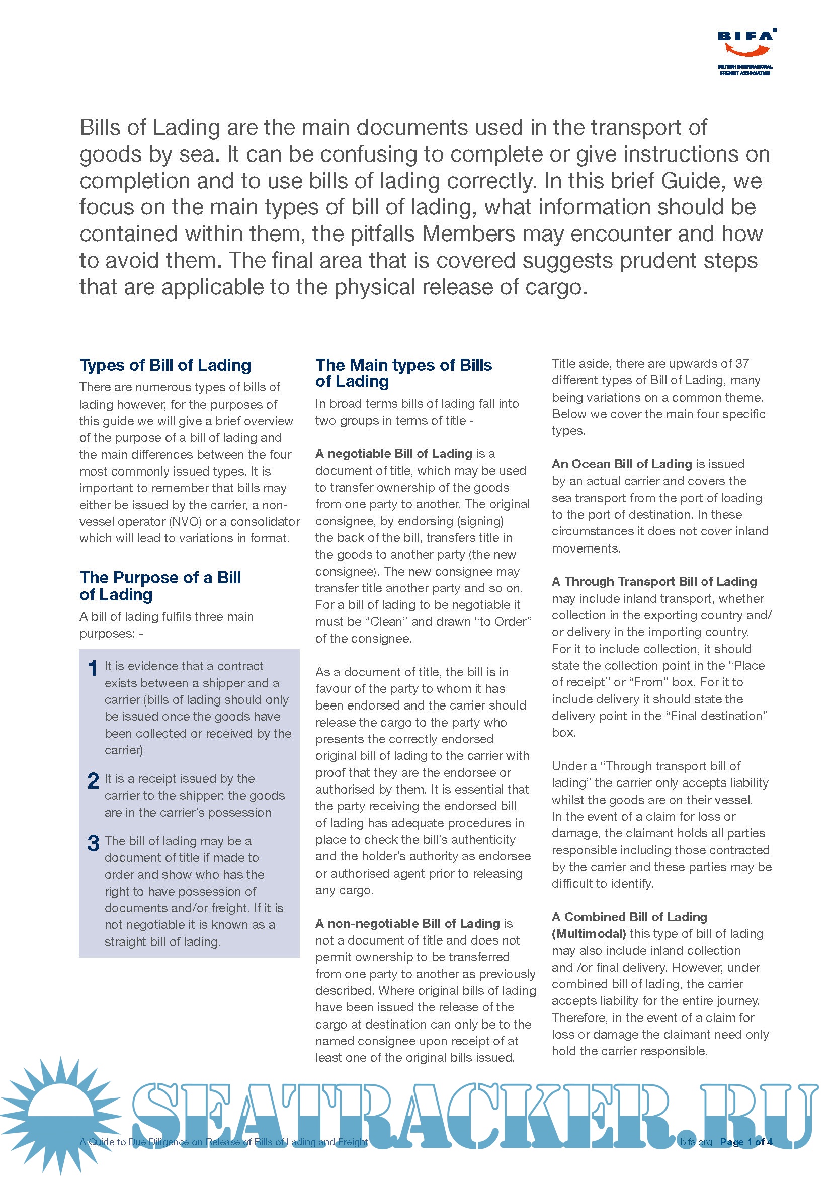 Year: 2018 Language: english Author: BIFA Genre: Guide Format: PDF Quality: eBook Pages count: >0 Description: Bills of Lading are the main documents used in the transport of goods by sea. It can be confusing to complete or give instructions on completion and to use bills of lading correctly. In this brief Guide, focus on the main types of bill of lading, what information should be contained within them, the pitfalls Members may encounter and how to avoid them. The final area that is covered suggests prudent steps that are applicable to the physical release of cargo.