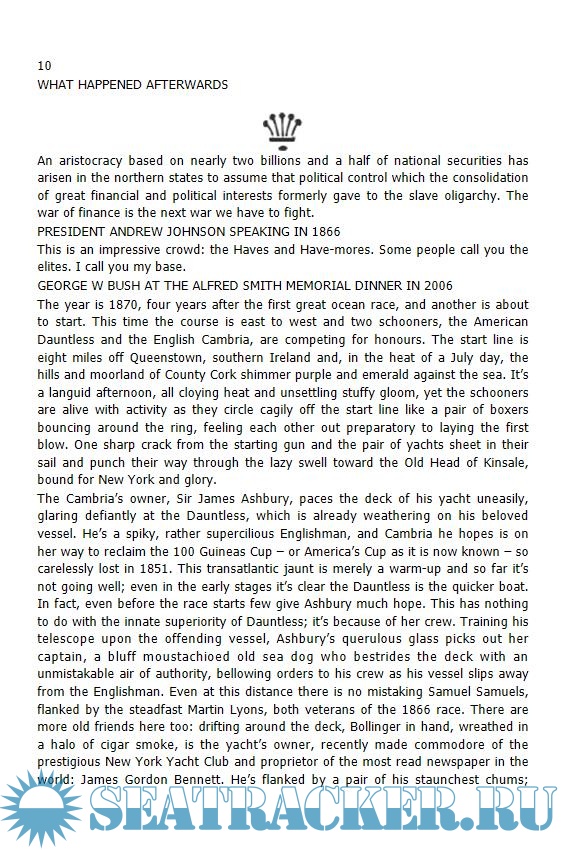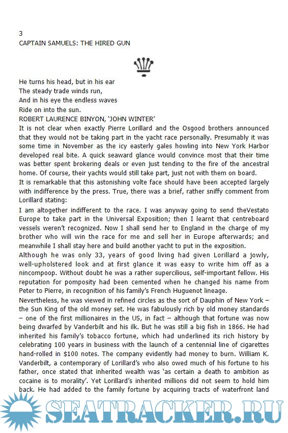 The narrative focuses on the victorious yacht Henrietta and her owner James Gordon Bennett. Bennett was the son of the multimillionaire proprietor of the New York Herald, and a notorious playboy. His infamous stunts included driving his carriage through the streets of New York naked, tipping a railway porter $30,000, and turning up at his own engagement party blind drunk and mistaking the fire for a urinal, which led to the coining of the phrase 'Gordon Bennett!'. However, Bennett was also a serious yachtsman and had served with distinction during the civil war aboard Henrietta, and he was the only owner to be aboard his own boat during the race.