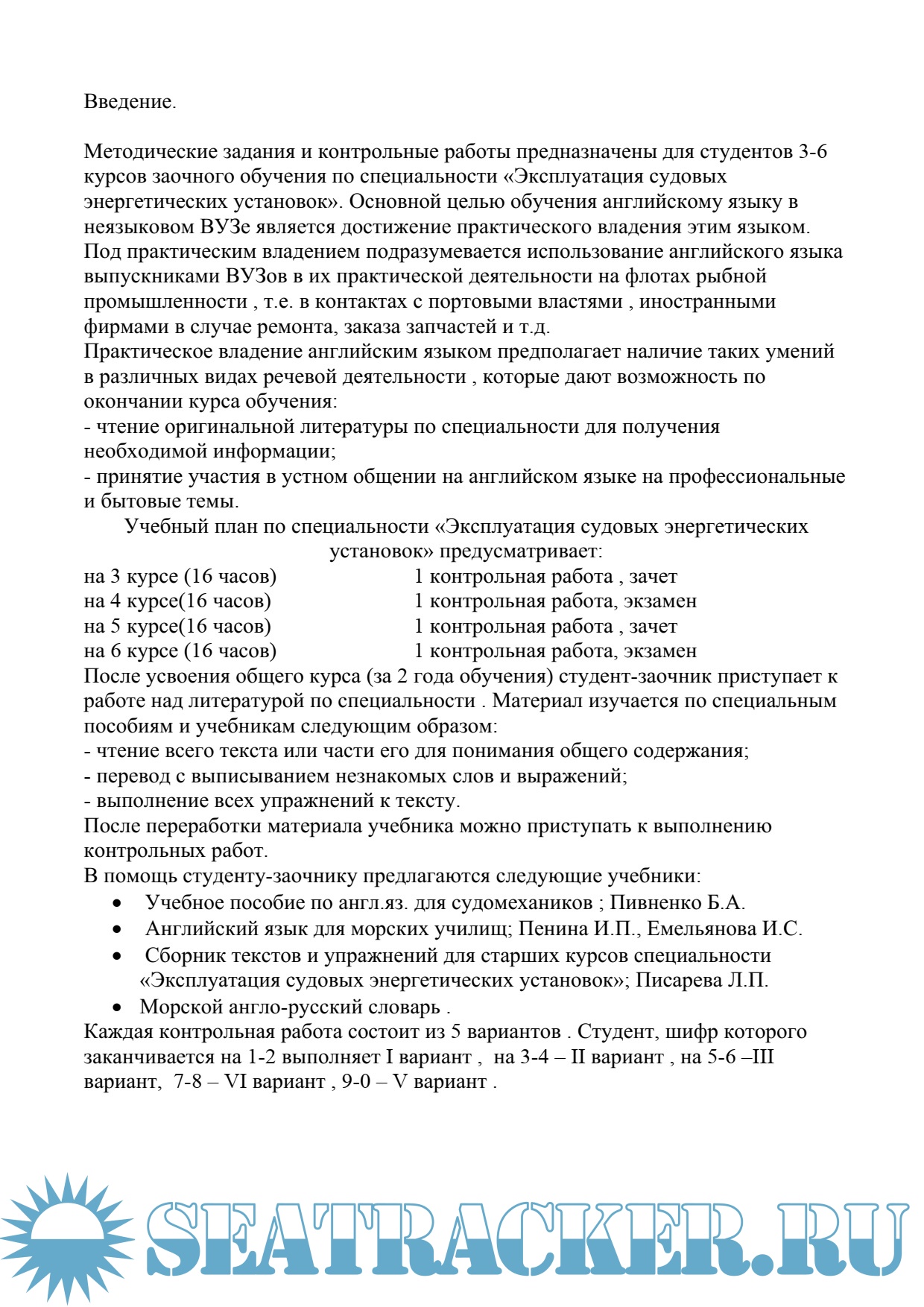 Описание: Методические задания и контрольные работы предназначены для студентов 3-6 курсов заочного обучения по специальности ''Эксплуатация судовых энергетических установок''. Методические указания разработаны в соответствии с типовой программой дисциплины ''Английский язык для судомехаников''. Приведены варианты заданий к контрольным работам и лексический минимум к каждой из тем