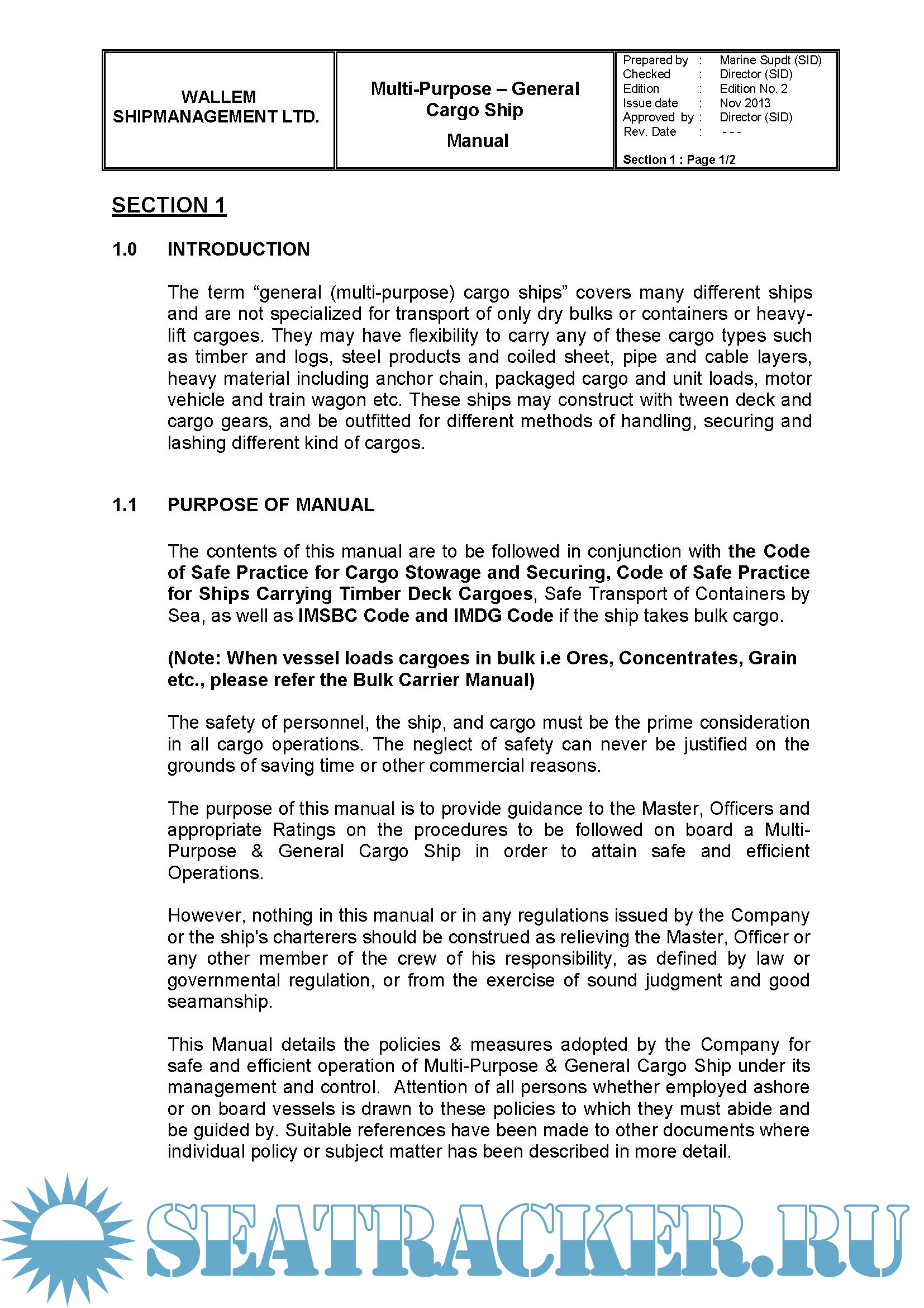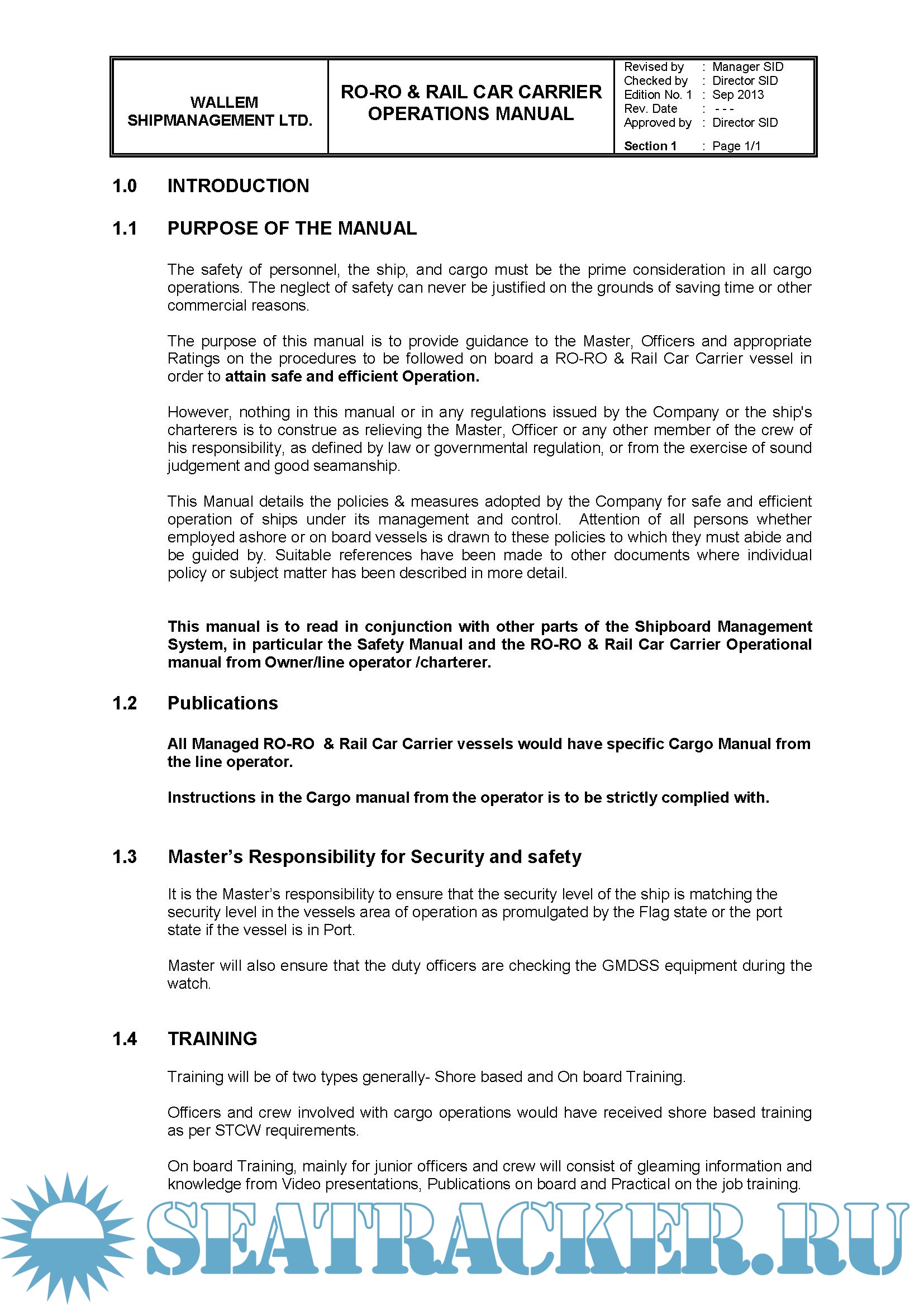 Description: The purpose of this manual is to provide guidance to the Master, Officers and approriate ratings on the procedures to be followed on board a vessel in order to attain safe and efficient operations. This Manuals details the policies and measures adopted by the Company for safe and efficient operation under its management and control.