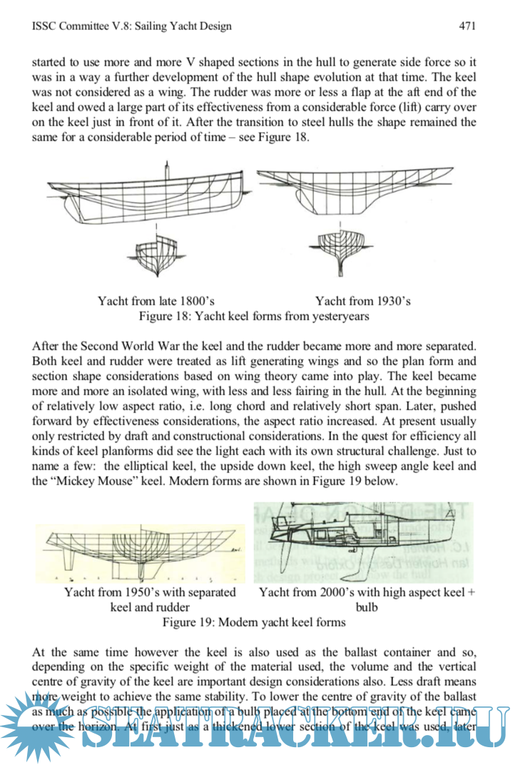 Year: 2009 Language: english Author: A. Shenoi et alli Genre: Research papers Format: PDF Quality: eBook Pages count: 61 Description: The history of yachts goes back a long way. The first appearances were in the 1600’s when wealthy Dutch merchants built and sailed small and relatively fast boats called “jacht” especially for pleasure. The real building and use of yachts sprung into life at the end of the 1800’s. In the context of the present report we will restrict our self to the period starting a little before the Second World War up to the present day. Originally “jachts” were built in wood and in construction quite similar to what was customary in the normal shipbuilding of that time. The hull was single (massive) planking connected to closely spaced wooden frames. The frames were connected to wooden floors and those to the bottom planking. In the early days many yachts still had flat or slightly curved bottoms. At the upper side the frames were connected to the deck beams on which the deck planking was laid. Longitudinal stringers were mostly absent. Later when yachts got keels the construction changed. The sections became rather more V shaped asking for different construction techniques. The stem beam, the keel beam and the stern beam were introduced, which functioned also as longitudinal stiffeners, to which the frames were connected, which in turn were connected by the floors. The difficulties and weaknesses in the available connecting techniques of that time however posed a serious limit on the achievable overall strength and in more in particular the overall rigidity of the yacht hull structure. All wooden construction was only to return in yacht building after the 1970’s, when new and serious bonding techniques became available, such as the epoxy resins, together with new wood laminating techniques. So in the 1930’s the new “composite” construction technique came into force, in which the keel, stem, stern, frames, beams and floors were all constructed in steel (and bolted or riveted, later welded together) to which the still wooden hull and deck planking was connected. This was a big improvement but still rather heavy.
