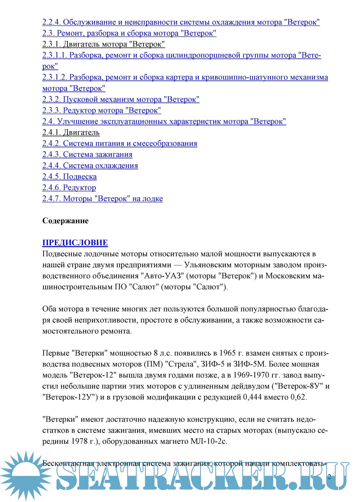 Описание: В справочнике изложены сведения по устройству подвесных лодочных моторов "Ветерок" и "Салют" различных модификаций. Приведены технические характеристики моторов и рекомендации по их грамотной эксплуатации, ремонту и обслуживанию. Рассмотрены наиболее типичные неисправности, методы их диагностики и устранения своими силами. Широко использован долголетний опыт многих водномоторников по усовершенствованию и ремонту различных узлов и систем подвесных моторов.