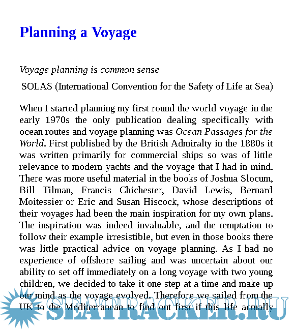 Year: 2012 Language: english Author: Jimmy Cornell Genre: Guide Publisher: Adlard Coles Nautical Edition: First ISBN: 978-1-4081-5631-5 Format: EPUB Quality: eBook Pages count: 1150 Description: Planning a voyage from anywhere in the world to anywhere in the world. This book is not only a valuable tool for sailors planing a voyage but it should appeal also to those who are still at the dreaming stage, in spirit already roaming the oceans. Cornell weighs up the pros and cons of various routes in every ocean, whether a one-way or round trip. All this in a style that comes obviously from the pen of a professional with great personal experience. This book provides more than just knowhow: it entertains and is pure enjoyment. In one word: it makes you want to go, and this is what makes Jimmy Cornell’s book so special.