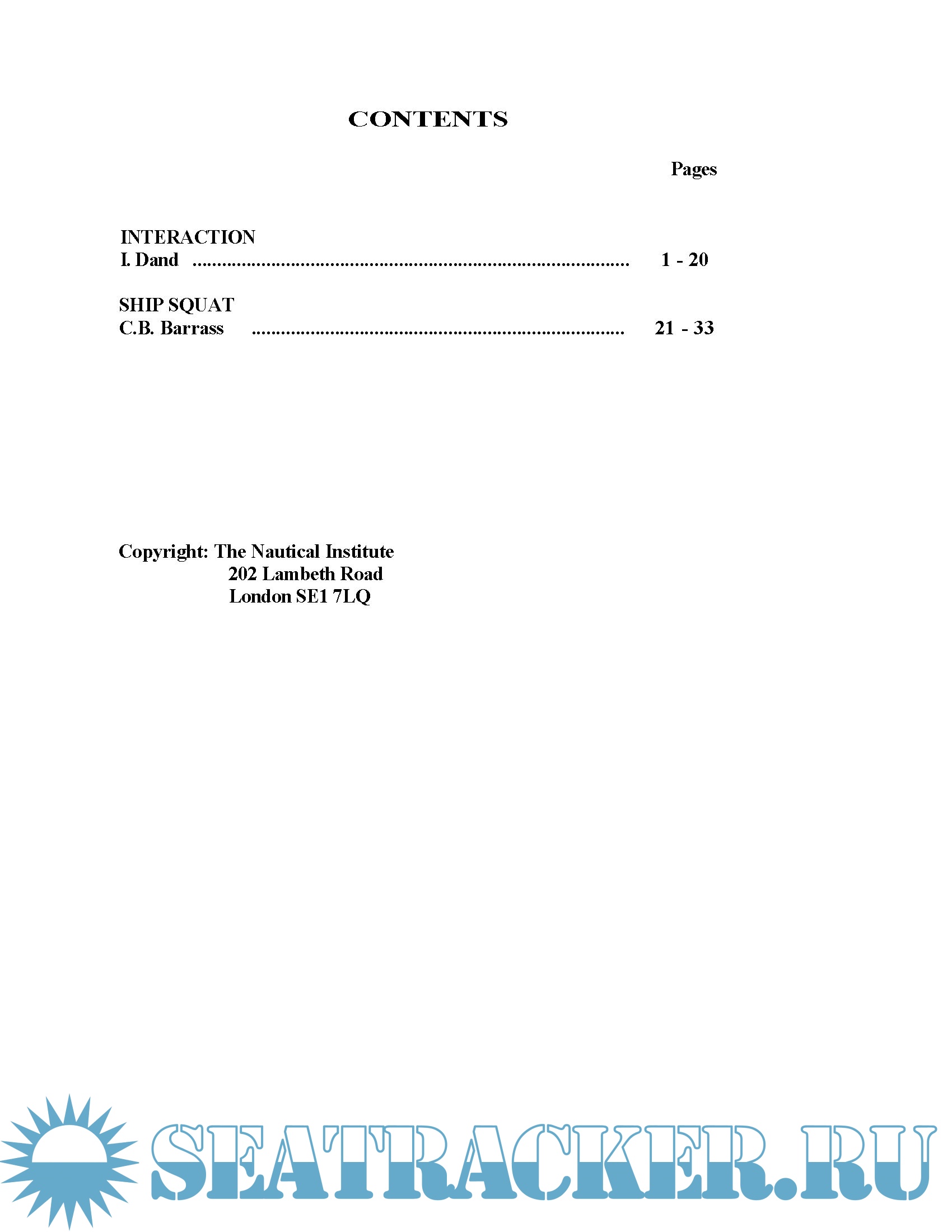 Year: 1995 Language: english Author: The Nautical Institute Format: PDF Quality: OCR without errors Pages count: 36 Description: As it is clear from the title, this book is fully dedicated to the squat interaction; the interaction at sea has some resonances with same effects on land. For example, you must have noticed the sway that is usually felt when a car either passes or is passed by a large truck on a road, or the suction that is always created by high speed trains when they are passing through the stations as well as the ground effects usually experiences by the airplanes taking off/landing. ... Clean copy and excerpts from the seminar's book regarding Interaction & Ship squat Only.