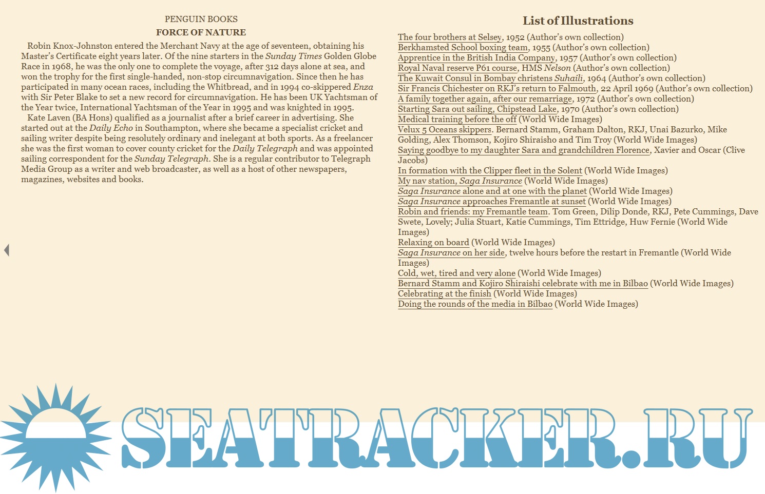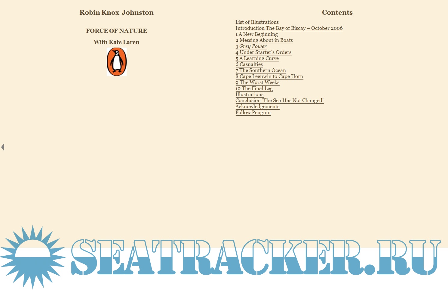 Year: 2007 Language: english Author: Robin Knox-Johnson Genre: - Publisher: Penguin Books Edition: 1 ISBN: 978-0-141-88973-3 Format: EPUB Quality: eBook Pages count: 150 Description: In January 1969, aboard his home-built wooden boat Suhaili, Sir Robin Knox-Johnston became the first person ever to sail solo, non-stop around the world. 25 years later, Sir Robin again completed a record-breaking circumnavigation, co-skippering Enza with Kiwi yachting legend Sir Peter Blake. His place in sailing's pantheon of greats was assured. Then, after the tragic death of his wife Sue, Sir Robin decided he would try again. In October 2006, at the age of 67 - when most people are settling in to a well-earned retirement - Sir Robin embarked on another gruelling single-handed race around the world. Compared to his rivals he lacked recent experience and a large shore-based support team. There were some who believed that this time he might have bitten off more than he could chew. Then early on, it looked like their worst fears might be realised.Within days of setting off, near-Hurricane-strength storms in the Bay of Biscay capsized his 60' yacht Saga Insurance. But it wasn't just Sir Robin who suffered. Three-quarters of the entire fleet had to run for shelter. When they re-emerged, all faced months of hardship and intensity ahead. "Force of Nature" is Sir Robin's first-hand account his extraordinary return to the ultra-competitive, punishing world of single-handed offshore racing. It turned out to be a very different journey to the one he undertook about Suhaili, yet his experience aboard her remains a touchstone throughout this story. It's a story of courage, ingenuity and resilience played out against the World's oceans. But most of all it's a powerful reminder that age is nothing but a number; no barrier to realizing one's dreams.
