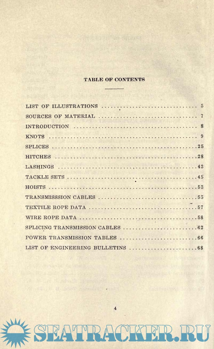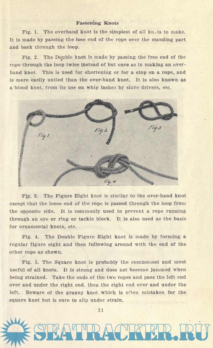 Description: A knowledge of knots has saved many a life in storm and wreck, and if everyone knew how to tie a knot quickly and securely there would be fewer casualties in hotel and similar fires where a false knot in the fire escape rope has slipped at the critical moment and plunged the victim to the ground. Many an accident has occurred through a knot or splice being improperly formed. Even in tying or roping a trunk, few people tie a knot that is secure and quickly made and yet readily undone. How many can tie a tow rope to a car so it will be secure and yet is easily untied after the car has been hauled out of the mud? Or suppose a rope was under strain holding a large timber in midair and a strand in the derrick guy rope shows signs of parting. How many could attach a rope each side of the weak spot to take the strain?