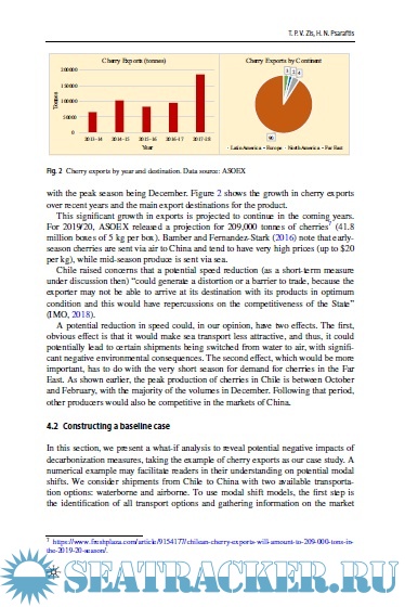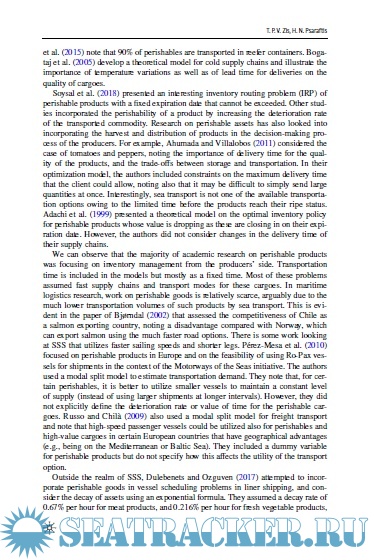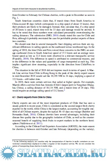 Description: The International Maritime Organization (IMO) has adopted a strategy to reduce emissions from international shipping that sets very ambitious targets. The first set of actions, so-called short-term measures, are expected to be implemented by 2023 and result in a reduction of emission intensity by at least 40% by 2030 compared with 2008 levels. Compliance may be achieved through a reduction in sailing speeds, but certain countries have raised concerns on the ramifications of longer transit times on their exports, particularly for perishable products. In this paper, we present a methodology to assess the impacts of various short-term measures on perishable products. We use an extension of a nested modal split model to examine shifts towards other modes of transport. We demonstrate our methodology with a transpacific case study carrying perishable products from South America to China. We compare the short-term measures currently under discussion, in one of the first academic studies to explore these issues. These include a speed limit approach, a power limit, and a goal-based measure. Our results show that a power limit or a goal-based measure would offer some advantages to liner shipping operators using more efficient vessels, unlike a speed limit. Using 2008 as the benchmark year has resulted in small speed reductions required by the liner shipping sector to reach its targets. For perishable cargoes, small speed reductions can be tolerated by the shippers without significant modal shift. Choosing the right short-term strategy is of utmost importance to promote clean shipping practices in the following years.