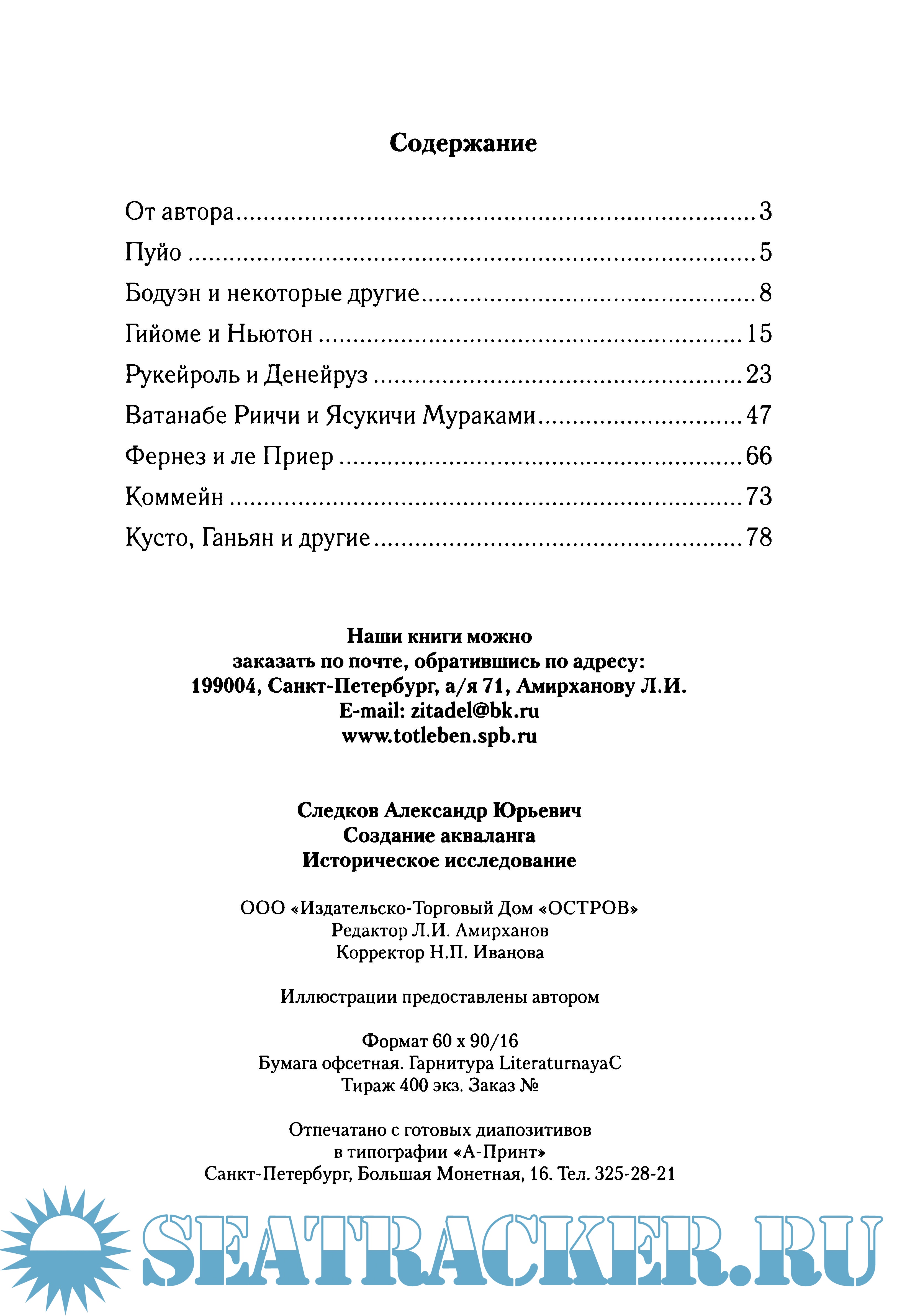 Год выпуска: 2010 Язык: русский Автор: Следков А.Ю. Жанр: История Издательство: Остров Формат: PDF Качество: Отсканированные страницы Количество страниц: 98 Описание: Александр Следков - известный ученый, доктор биологических наук, специалист в области физиологии и водолазной медицины, автор полутора сотен научных трудов, основатель и президент Общества изучения истории водолазного дела им. Р. А. Орбели. Книга впервые рассказывает об истории создания акваланга - аппарата, благодаря которому тысячи людей познают подводный мир нашей планеты. Об истории, в которой Жак-Ив Кусто занимает далеко не первое место. Предназначена специалистам и любителям подводного плавания, а также всем, кто интересуется историей развития техники и технологий. Иллюстрации предоставлены Российским обществом изучения истории водолазного дела.