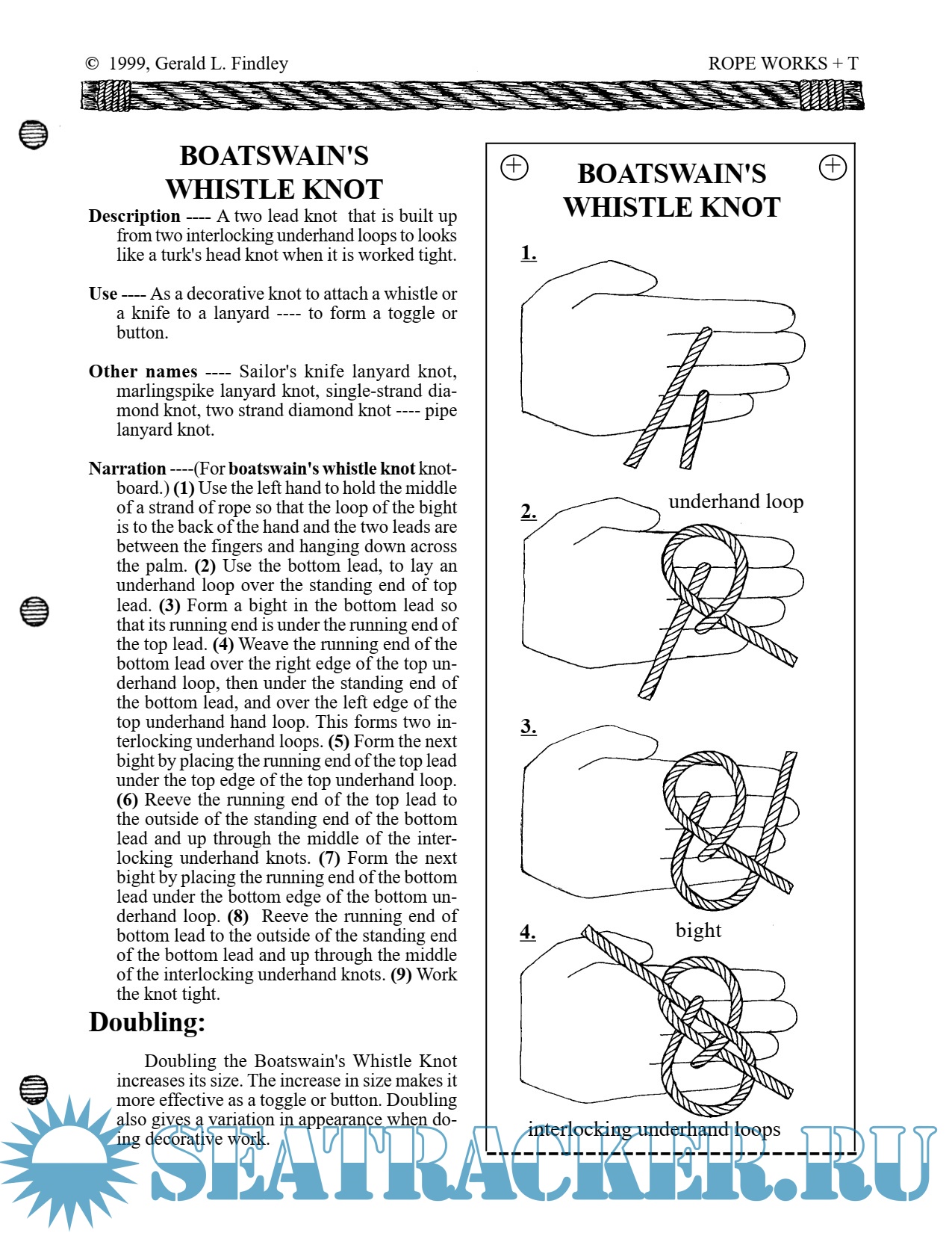 Year: 1999 Language: english Author: Findley G. Genre: Manual Publisher: BookSurge Publishing Format: PDF Quality: Scanned pages Pages count: 112 Description: Rope Works is a book of knots, hitches, splices, lashings and rope making. Rope Works presents a series of intructions illustrated in a knotboard format. The instructions are especially helpful for individuals or groups intrested in learning to tie knots with confidence. In addition, Rope Works contains plans for several different hand operated rope machines.