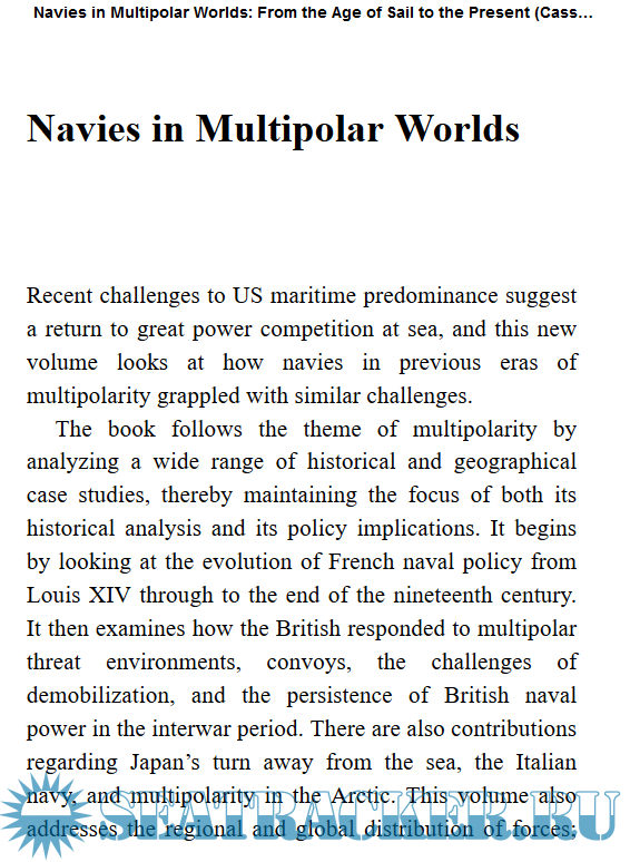 Year: 2021 Language: english Author: Paul Kennedy Genre: History Publisher: Routledge ISBN: 0367427222 Format: PDF Quality: eBook Pages count: 277 Description: Recent challenges to US maritime predominance suggests a return to great power competition at sea, and this new volume looks at how navies in previous eras of multipolarity grappled with similar challenges. The book follows the theme of multipolarity by analysing a wide range of historical and geographical case studies, thereby maintaining the focus of both its historical analysis and its policy implications. It begins by looking at the evolution of French naval policy from Louis XIV through to the end of the nineteenth century. It then examines how the British responded to multipolar threat environments, convoys, the challenges of demobilization, and the persistence of British naval power in the interwar period. There are also contributions regarding Japan’s turn away from the sea, the Italian navy, and multipolarity in the Arctic. This volume also addresses the regional and global distribution of forces; trade and communication protection; arms races; the emergence of naval challengers; fleet design; logistics; technology; civil-naval relations; and grand strategy, past, present, and future. This book will be of much interest to students of naval history, strategic studies and international relations history, as well as senior naval officers.