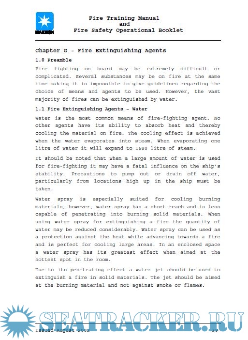 The Fire Safety Training Manual and the Fire Safety Operational Booklet complies with the amendments to SOLAS Chapter II Regulation 15 and 16, which came into force on 1st July 2002.