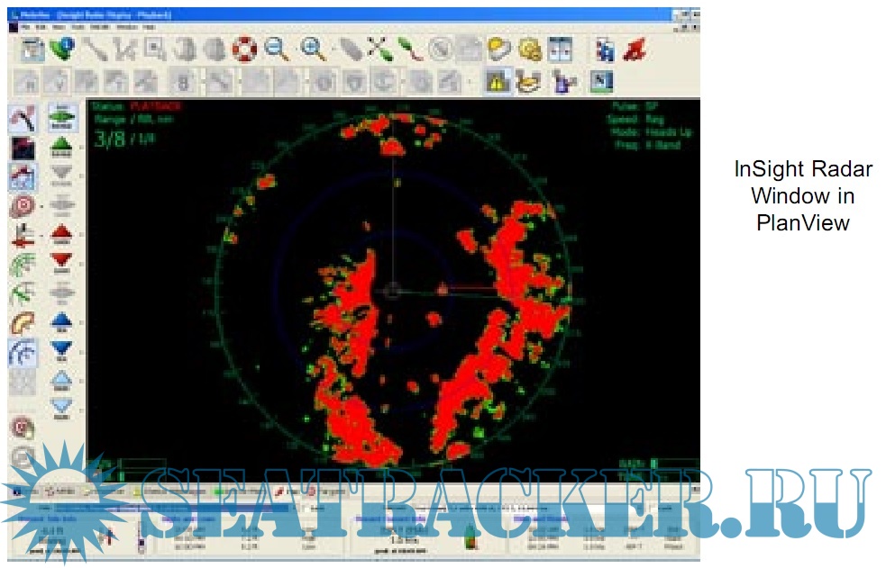 If the InSight Radar option is installed on top of the Nobeltec Visual Navigation Suite or Admiral programs, the version of the program is followed by an “R” (e.g. Version 7.0.793R) and will say InSight Radar on the Help | About screens. You will also see a Radar drop down menu near the other menu options.