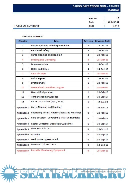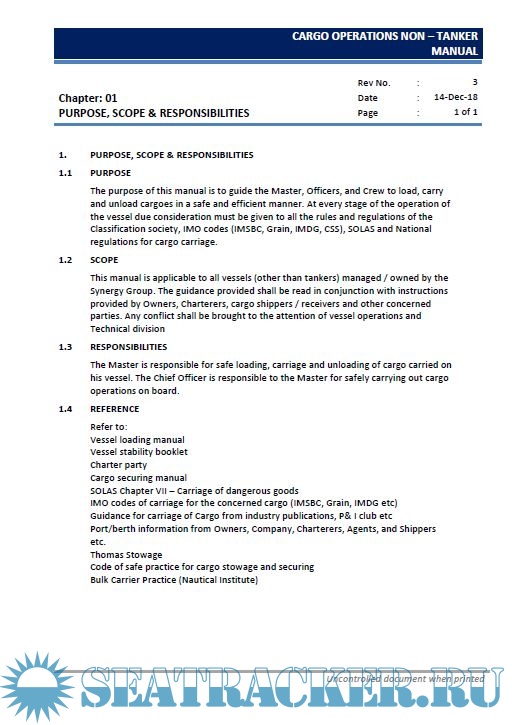 Description: The purpose of this manual is to guide the Master, Officers, and Crew to load, carry and unload cargoes in a safe and efficient manner. At every stage of the operation of the vessel due consideration must be given to all the rules and regulations of the Classification society, IMO codes (IMSBC, Grain, IMDG, CSS), SOLAS and Nationalregulations for cargo carriage.