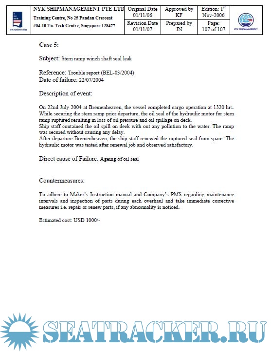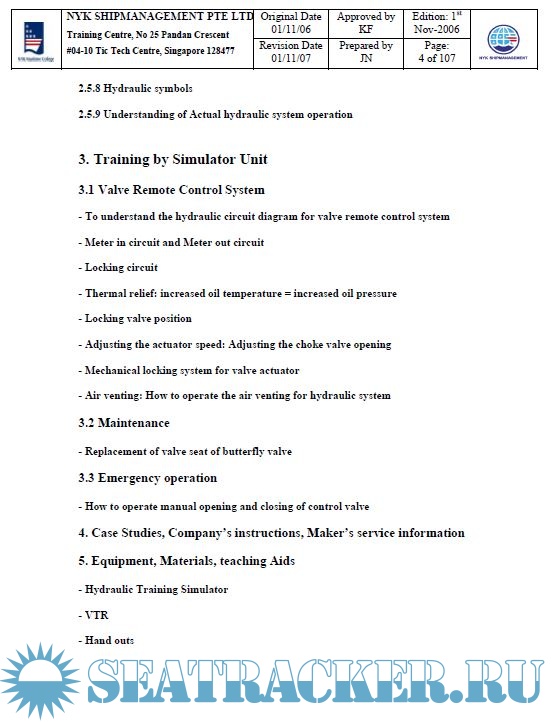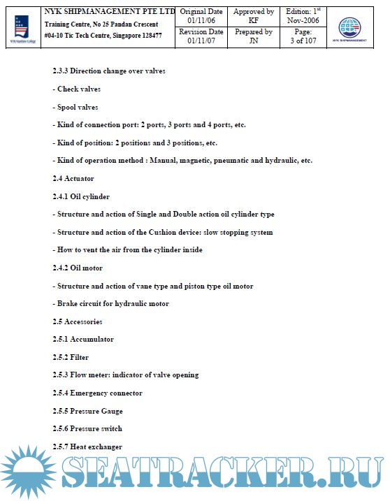 Year: 2007 Language: english Author: NYK Maritime College Genre: Training courses Publisher: NYK Maritime College, Singapore Edition: 1st Format: PPT Quality: eBook Pages count: Multiple Description: Course Code: NMC 24 Course Name: Hydraulic Training Duration: 1 Day Objectives of the Training: After completion of the training, the trainees should understand the followings: 1) The principle of oil hydraulic system 2) The structure and the function of equipments 3) Adjusting of valve operation speed 4) Maintenance work 5) Emergency operation.