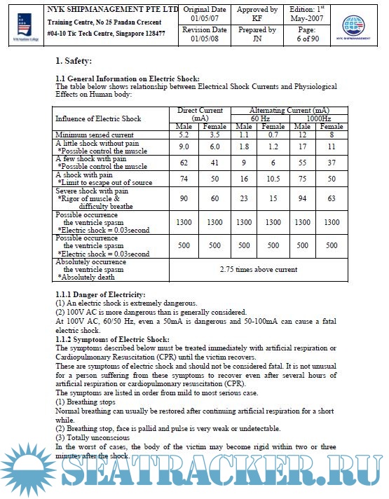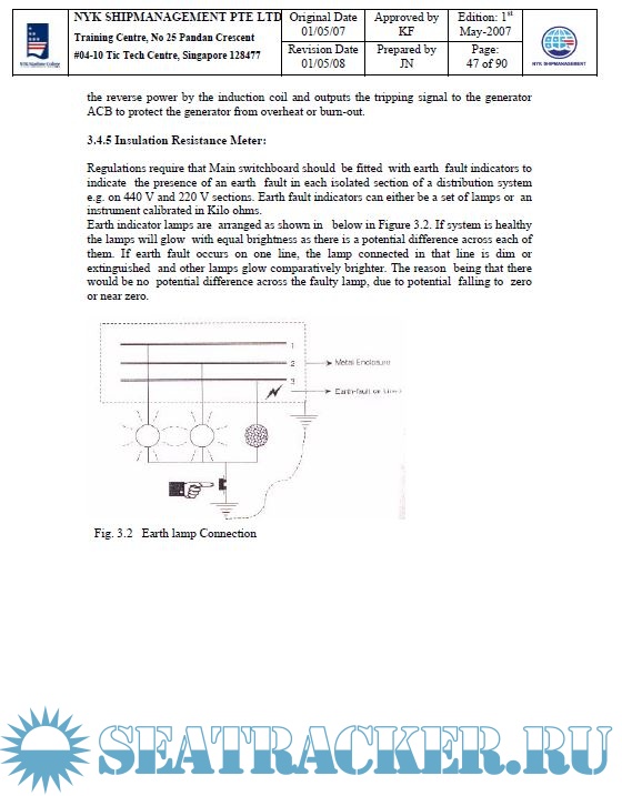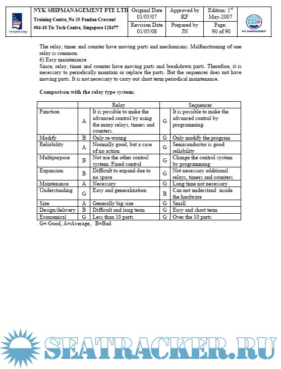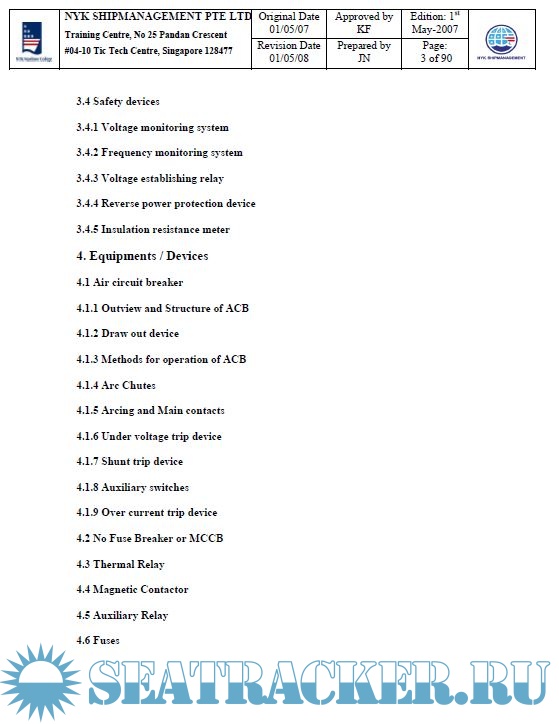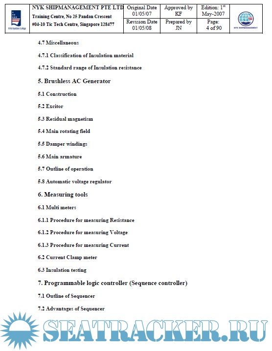 Year: 2008 Language: english Author: NYK Maritime College Genre: Training courses Publisher: NYK Maritime College, Singapore Edition: 1st Format: PPT Quality: eBook Pages count: Multiple Description: Course Code: NMC Code 27 Course Name: Electrical Training Duration: 4 Days Objectives of the Training After completion of the courses, trainees should understand the followings: 1) The Safety Guidelines and Hazardous zone precautions 2) Electrical drawings 3) Arrangement of the Main switchboard and group starter panel 4) Function of the equipments for switchboard and starter panel 5) Measurement tools 6) Sequence Diagram 7) Programmable logic controller, sequence controller