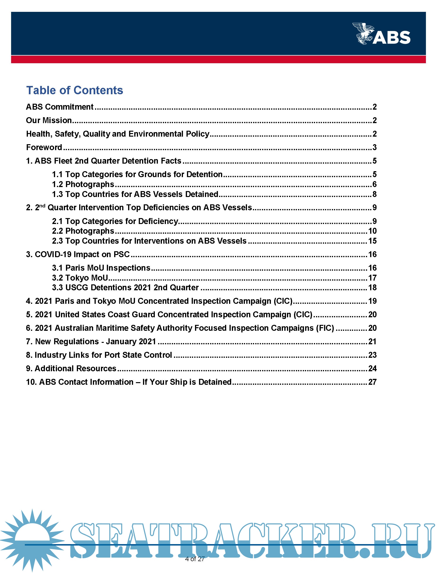 Year: 2021 Language: english Author: ABS Genre: Research papers Format: PDF Quality: eBook Pages count: 27 Description: This ABS Quarterly Report on Port State Control (PSC) provides information to owners on deficiencies identified on ABS vessels during inspections carried out by the various PSC regimes globally during the 2nd Quarter of 2021. This report is being made available to assist owners by providing awareness of potential areas of concern that have been identified on ABS classed vessels.