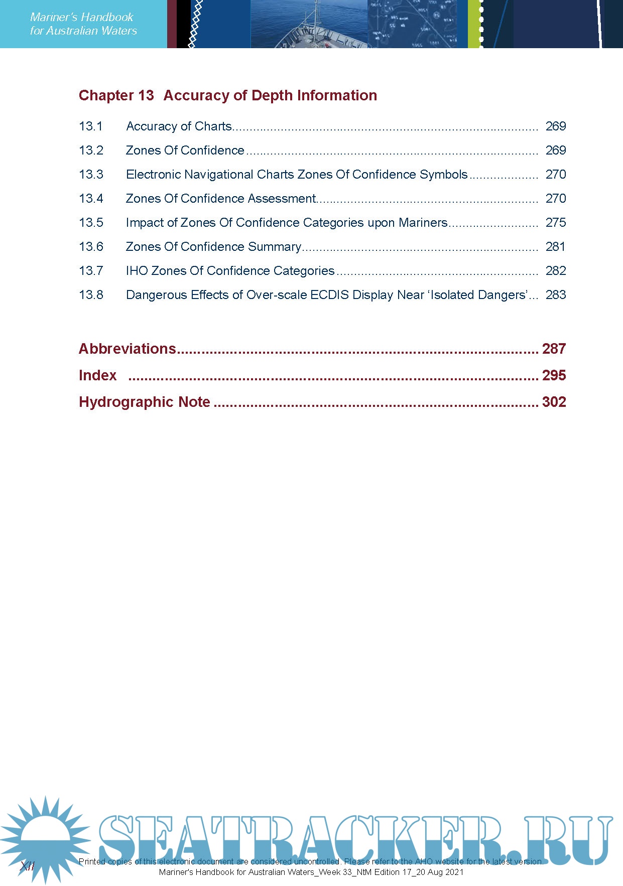 Additional info: Included AHP20 Supplement CH13: Mariner's Guide to Accuracy of Depth Information in ENC. Information regarding the accuracy of depth information in Electronic Navigational Charts (ENC), and how mariners should interpret that information, forms a chapter of the Mariner’s Handbook for Australian Waters. However, this information is also likely to be useful to mariners and maritime training organiZations that do not require the accompanying regulatory and procedural information contained in other chapters.