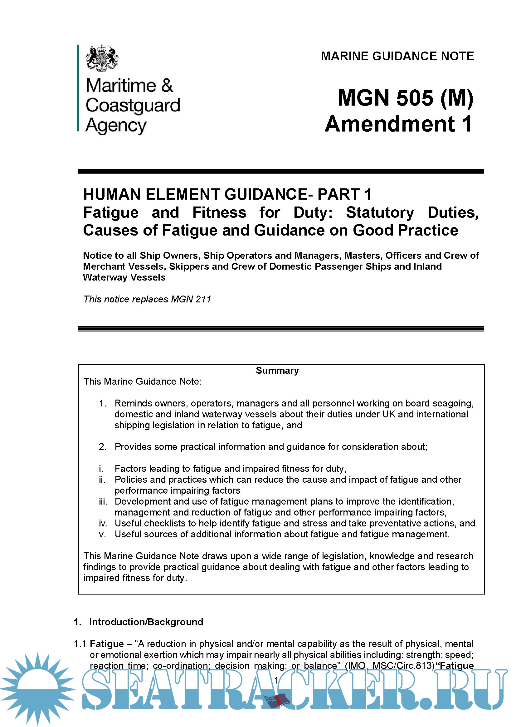 MARINE GUIDANCE NOTE MGN 505 (M) Amendment 1 HUMAN ELEMENT GUIDANCE- PART 1 Fatigue and Fitness for Duty.Published: April 2021