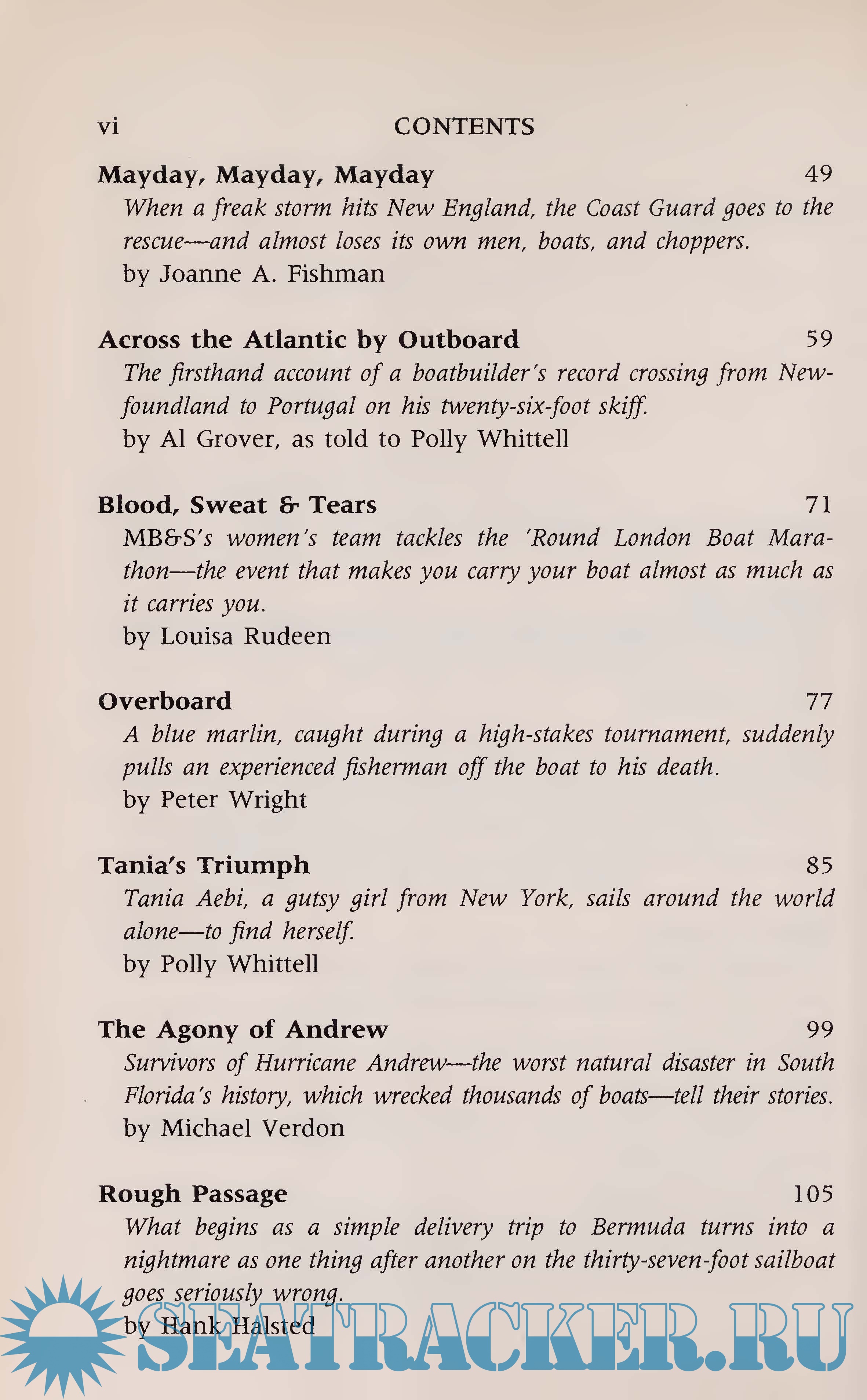 Year: 1998 Language: english Author: Edited by Louisa Rudeen Genre: Practical guide Publisher: AVON BOOKS, INC Edition: First ISBN: 0-380-79861-1 Format: PDF Quality: Scanned pages Pages count: 276 Description: Motor Boating & Sailing is about boating for pleasure. In the course of working for the magazine, we MB&S's editors and contributors—have found that most boating is exactly that: a real pleasure. You spend your days cruising on a well-designed, solidly constructed craft in calm waters. On board with you are friends and family, glad for the chance to be spending time together at an unhurried pace. Overhead, seabirds soar through sunny skies. Dolphins leap in your bow wave. You cast out a line and catch your supper. As our Editor-in-Chief and Publisher Peter Janssen writes, "Life doesn't get any better than this." But this book is not about those carefree times. This is an anthology of adventure stories that have run in the magazine over the past two decades true stories that deal with those rare occasions when nature turns from a gentle companion to a wrathful enemy; when the going gets rough and there's no place to hide; when it all comes down to a man and woman against the sea.