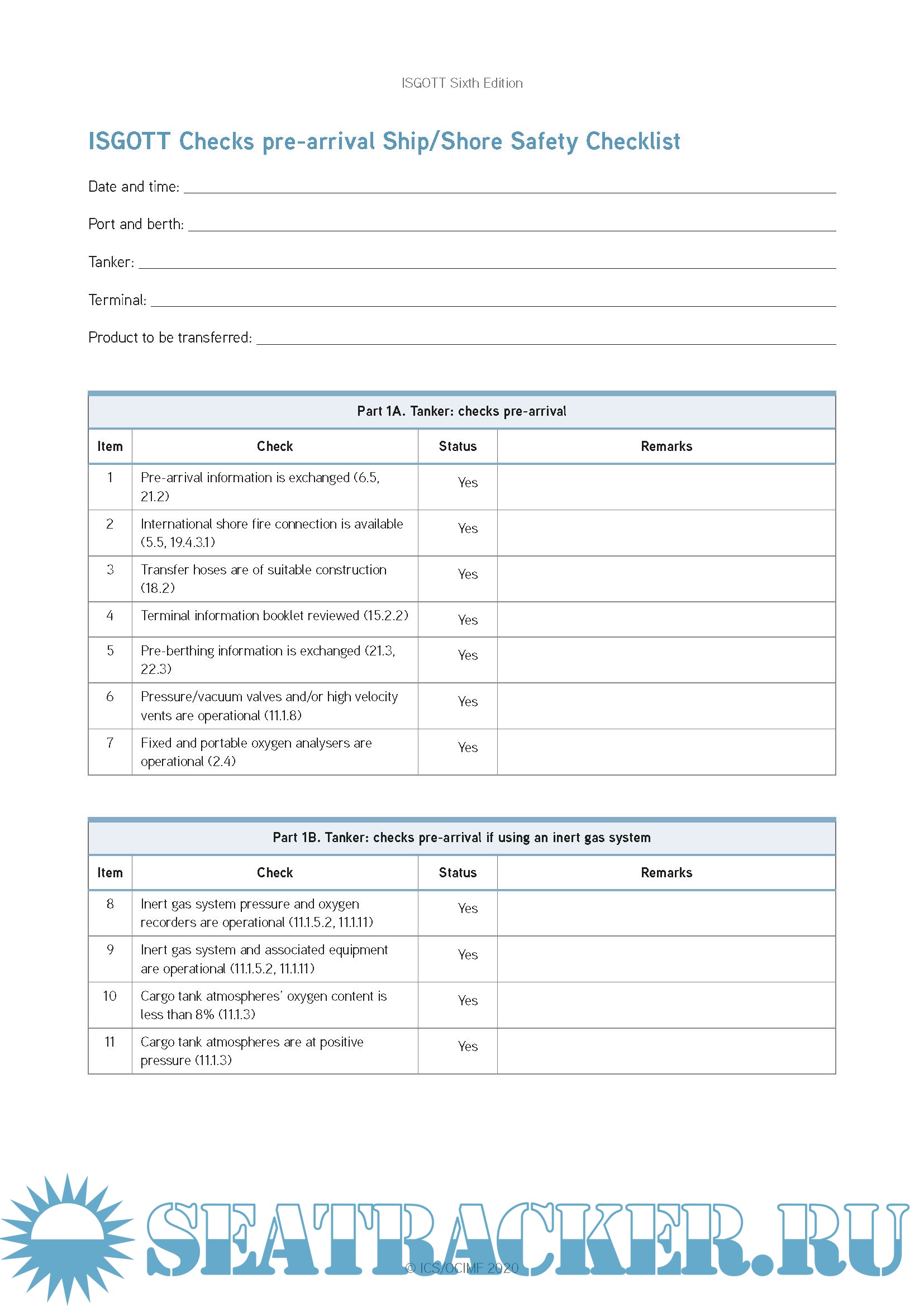 ISGOTT Checks pre-arrival Ship/Shore Safety Checklist - OCIMF, ICS, IAPH [2020, PDF]