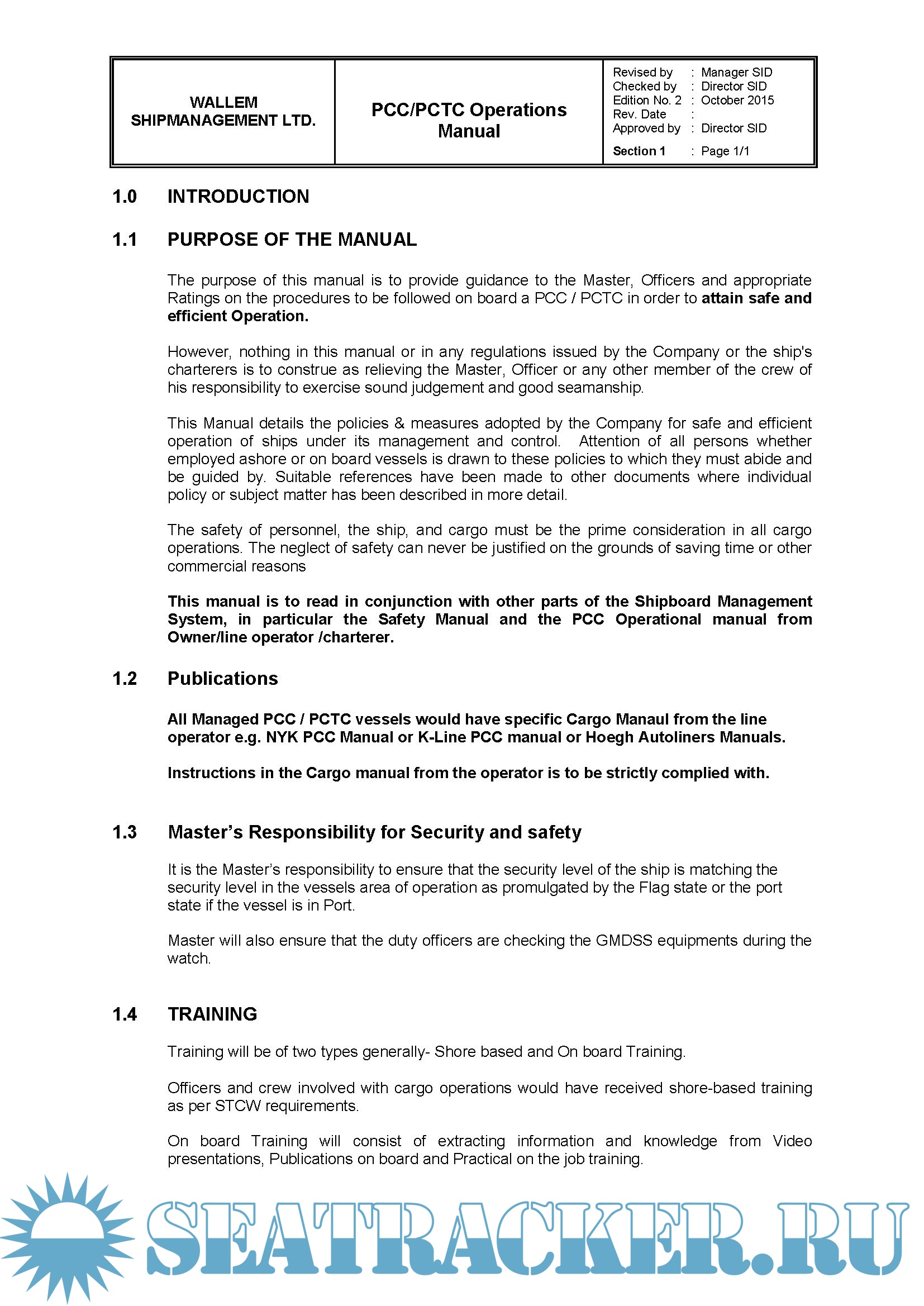 Description: The purpose of this manual is to provide guidance to the Master, Officers and appropriate Ratings on the procedures to be followed on board a PCC / PCTC in order to attain safe and efficient Operation.