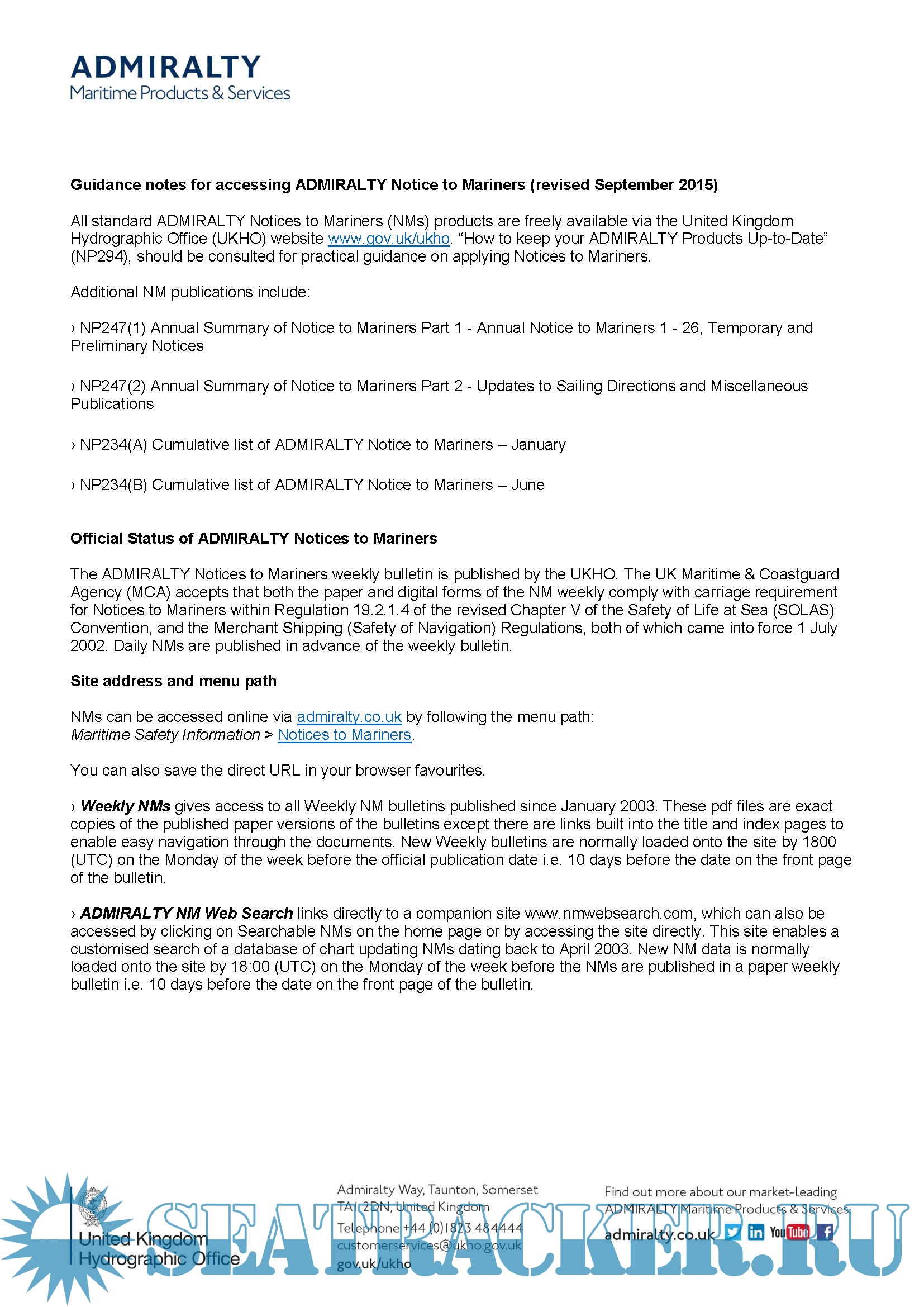 Description: To supplement Weekly NMs, the UKHO produces an Annual Summary of Notices to Mariners (NP247). This publication contains the Annual Statutory Notices to Mariners Numbers 1-26, a summary of Temporary and Preliminary Notices to Mariners still in force at the start of the year, and a Cumulative Summary of Amendments to ADMIRALTY Sailing Directions.