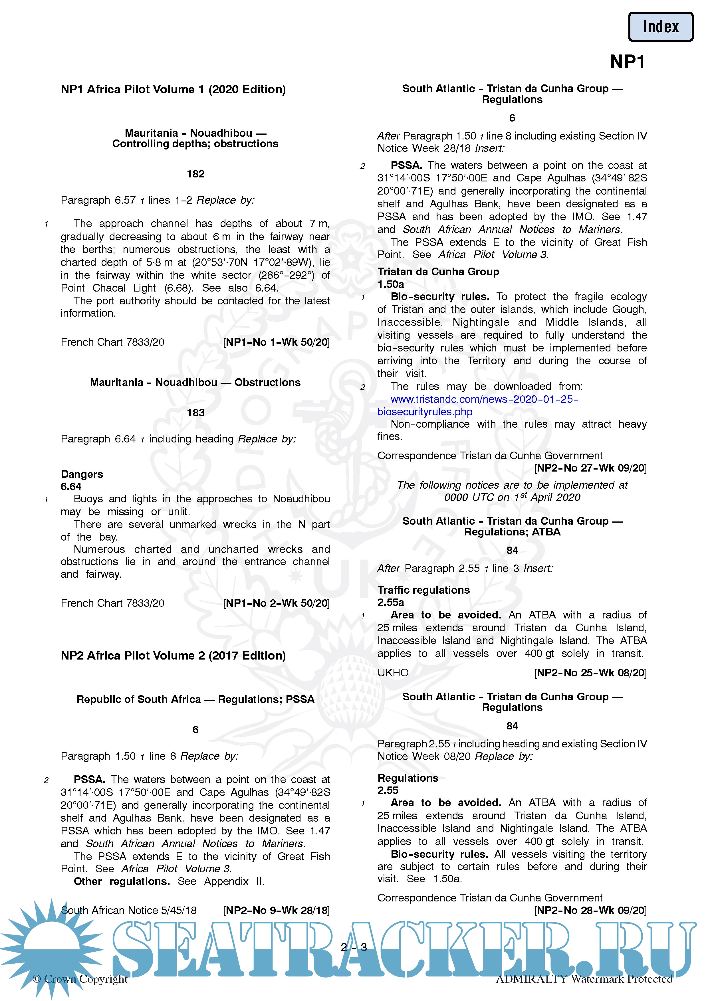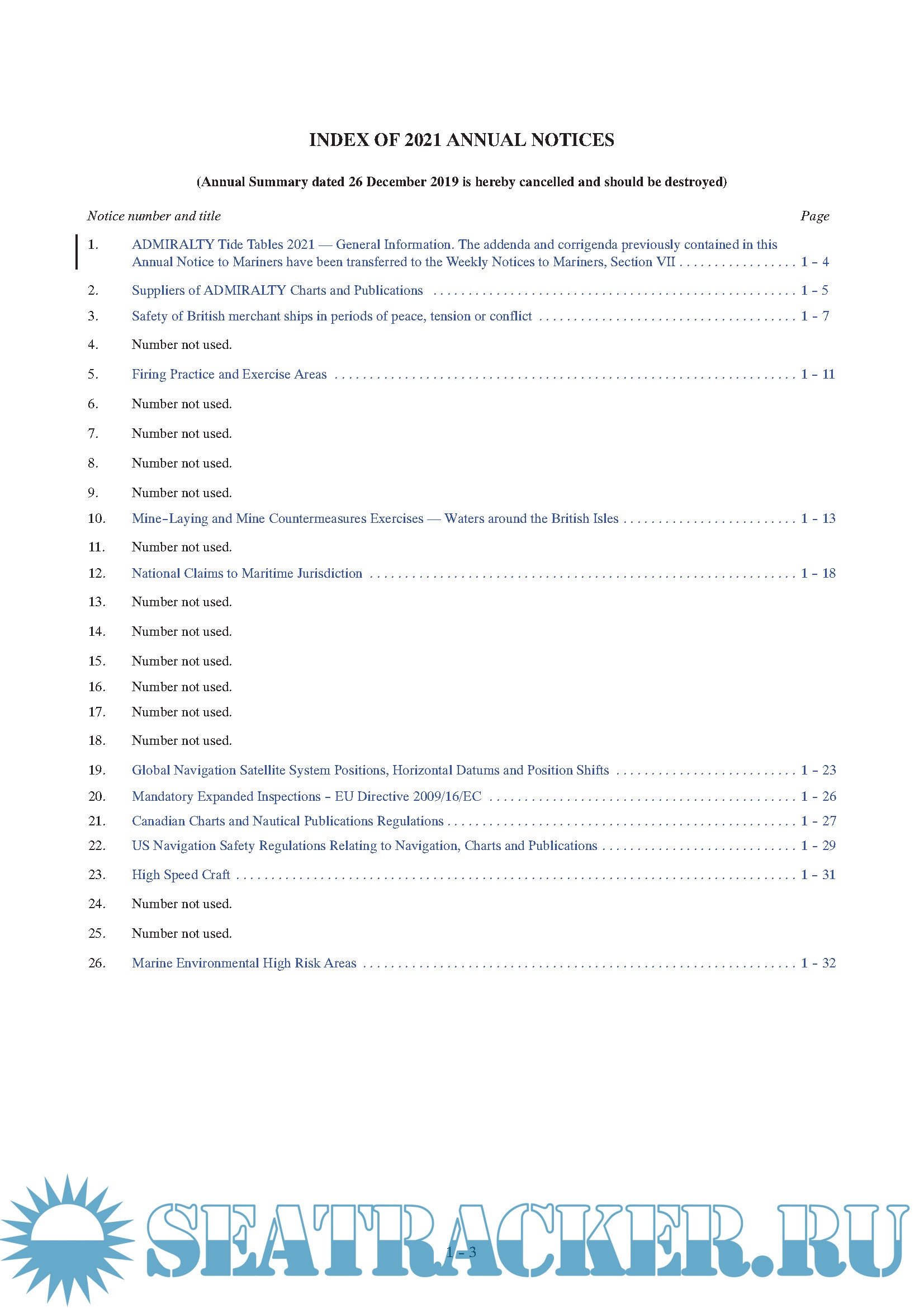 Year: 2021 Language: english Author: UKHO Publisher: UKHO Edition: 31 December 2020 Format: PDF Quality: eBook Pages count: Multiple Description: To supplement Weekly NMs, the UKHO produces an Annual Summary of Notices to Mariners (NP247). This publication contains the Annual Statutory Notices to Mariners Numbers 1-26, a summary of Temporary and Preliminary Notices to Mariners still in force at the start of the year, and a Cumulative Summary of Amendments to ADMIRALTY Sailing Directions.