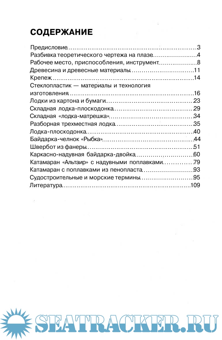 Предисловие. Разбивка теоретического чертежа на плазе. Рабочее место, приспособления, инструмент. Древесина и древесные материалы. Крепеж. Стеклопластик — материалы и технология изготовления. Лодки из картона и бумаги. Складная лодка-плоскодонка. Складная «лодка-матрешка». Разборная трехместная лодка. Лодка-плоскодонка. Байдарка-челнок «Рыбка». Швербот из фанеры. Каркасно-надувная байдарка-двойка. Катамаран «Альтаир» с надувными поплавками. Катамаран с поплавками из пенопласта. Судостроительные и морские термины. Литература.