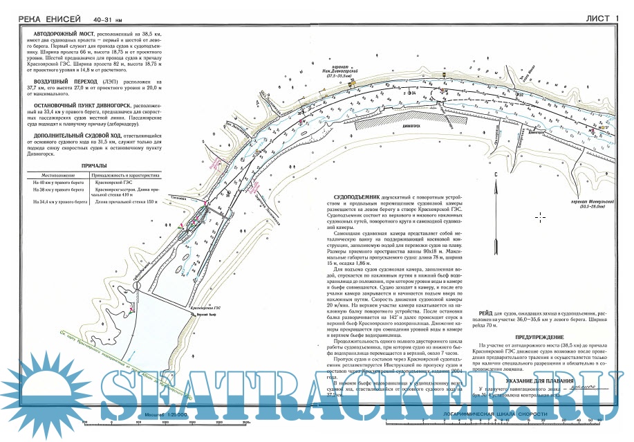 Тексты, помешенные на листах карты, содержат наиболее важные извлечения из действующих Правил плавания по внутренним водным путям РФ и документа «Особенности движения судов по внутренним водным путям Енисейского бассейна», а также рекомендации, направленные на обеспечение безопасности судоходства, и другие полезные для судоводителей лоцийные сведения.