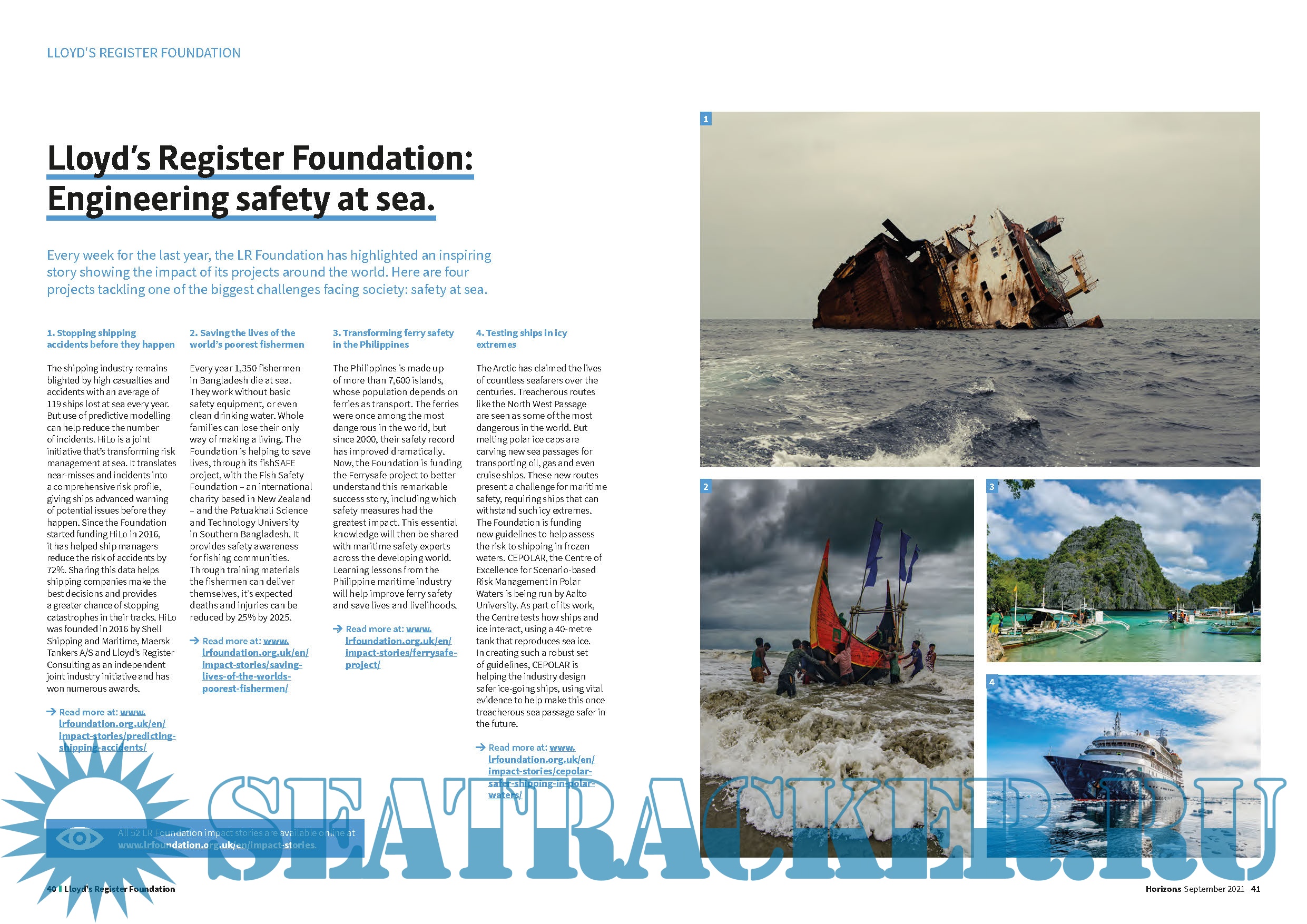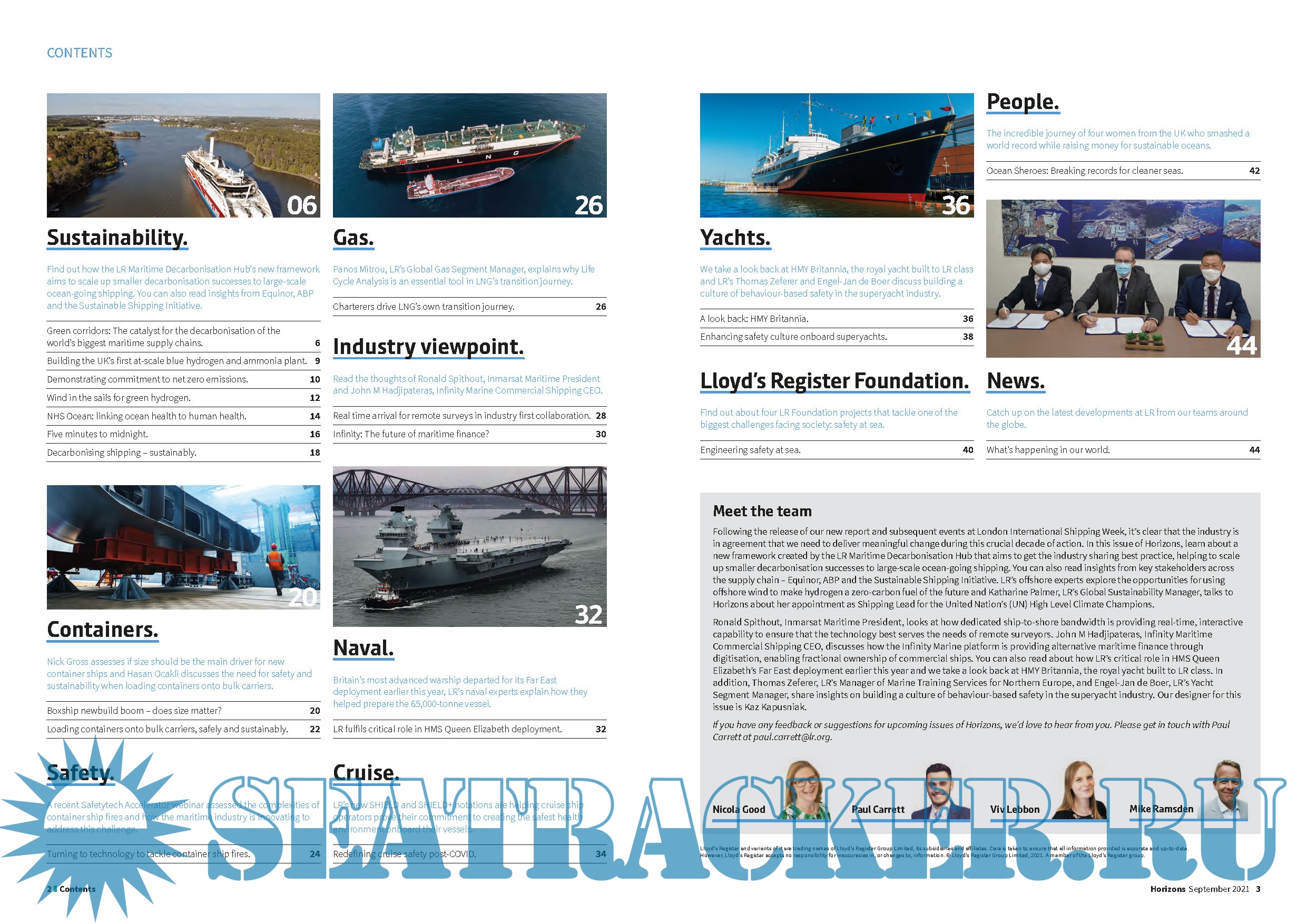 You’ll also find the most recent industry developments on safety. With a number of bulk carrier owners and operators exploring the commercial opportunity to carry containerised cargo, Horizons examines the key safety considerations. In the cruise sector, hear how LR’s s new SHIELD and SHIELD+ notations are redefining crew and passenger safety, post‑COVID. You can also read about LR’s critical role in HMS Queen Elizabeth’s Far East deployment earlier this year and we take a look back at HMY Britannia, the royal yacht built to LR class.